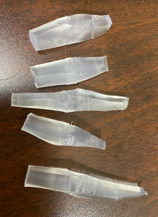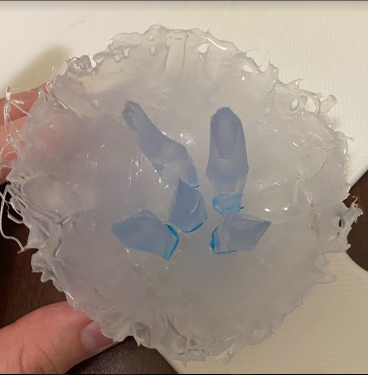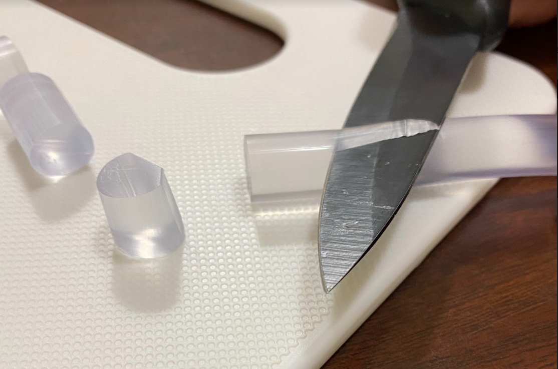 Cut glue sticks into 1 inch pieces. Begin to cut chunks off of the edges in order to make crystal-like structures. There should be around 4 or 5 large crystals that will act as our main crystals. Also make sure to cut some smaller crystals with a less defined shape. These will be about 1/4 - 1/2 of an inch long and will act as a filler. Use the scraps from the previous crystals to make fine shavings. This will reduce waste and improve the quality of the geode. Cut slowly, carefully, and away from your hands/body to reduce risk of injury.