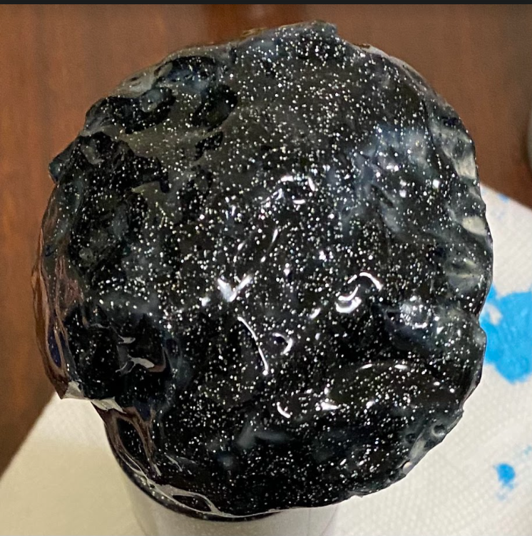 Use a paintbrush to apply black glitter glue to the outside of the geode. The black glitter glue should not be applied on the edges or the crystals. For the shiny trim, use gold glitter glue around the edges of the geode. This should be a thin layer of glue that covers the entire edge. Make sure to dip your paint brush in the water and wipe it off on a paper towel after use. Optional: instead of glitter glue, try using gold/silver paint or gold/silver sand.