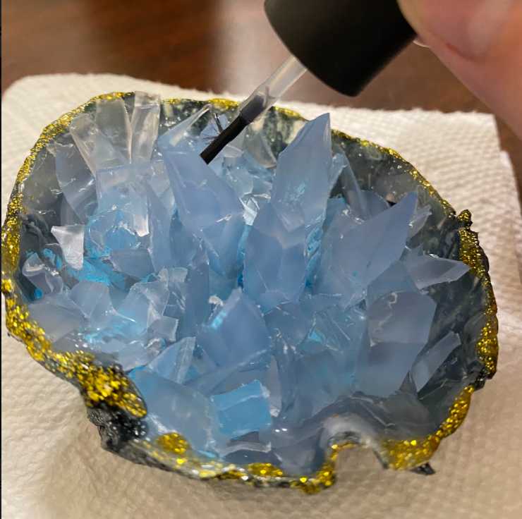 Use clear nail polish and paint a thin layer over the entire geode. This will give it a shiny finish, while also adding an extra layer of protection over the materials. This step is optional, however if sand or glitter is used instead of paint, it is strongly recommended.