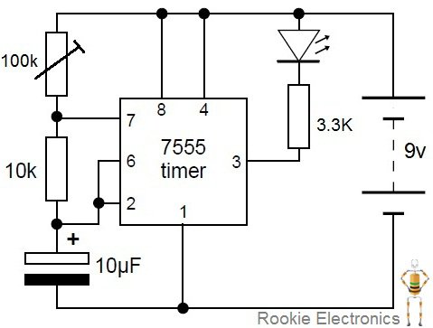 The first circuit I recommend you to build is a flashing LED. The circuit diagram is the first image.