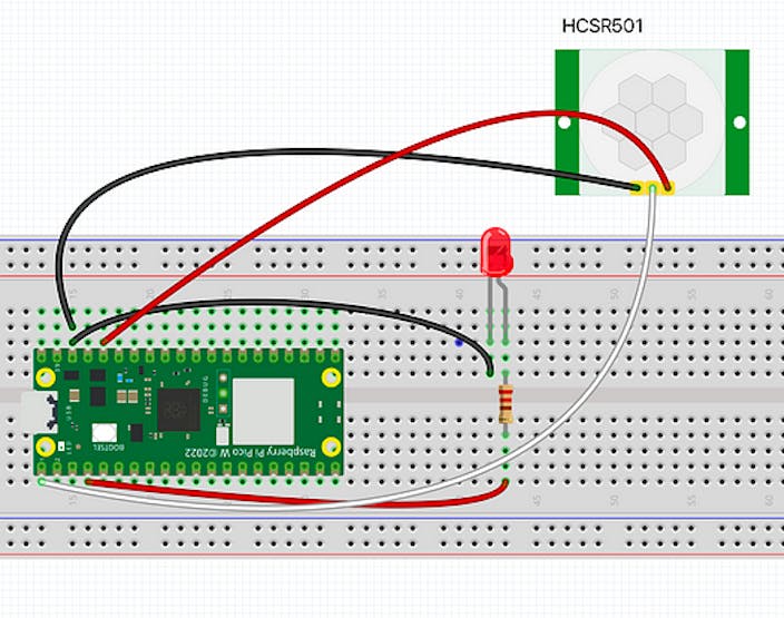 - Connect the OUT pin of the HCSR501 to GPIO 0 on the Pico.