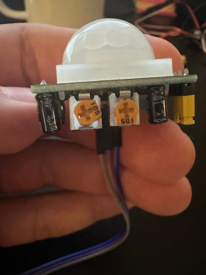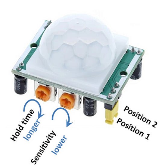 The HCSR501 PIR sensor includes two adjustable potentiometers that allow you to fine-tune its behavior: