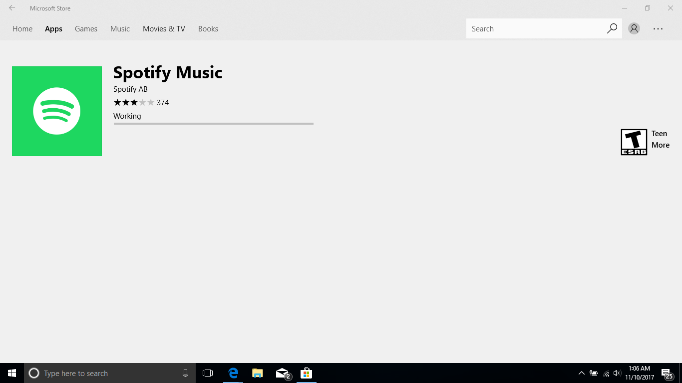 When you click on the top app after you searched for Spotify you will see this page. Click on the blue GET button to start the download. it will first say its working then it will say its downloading. This could take a few moments.
