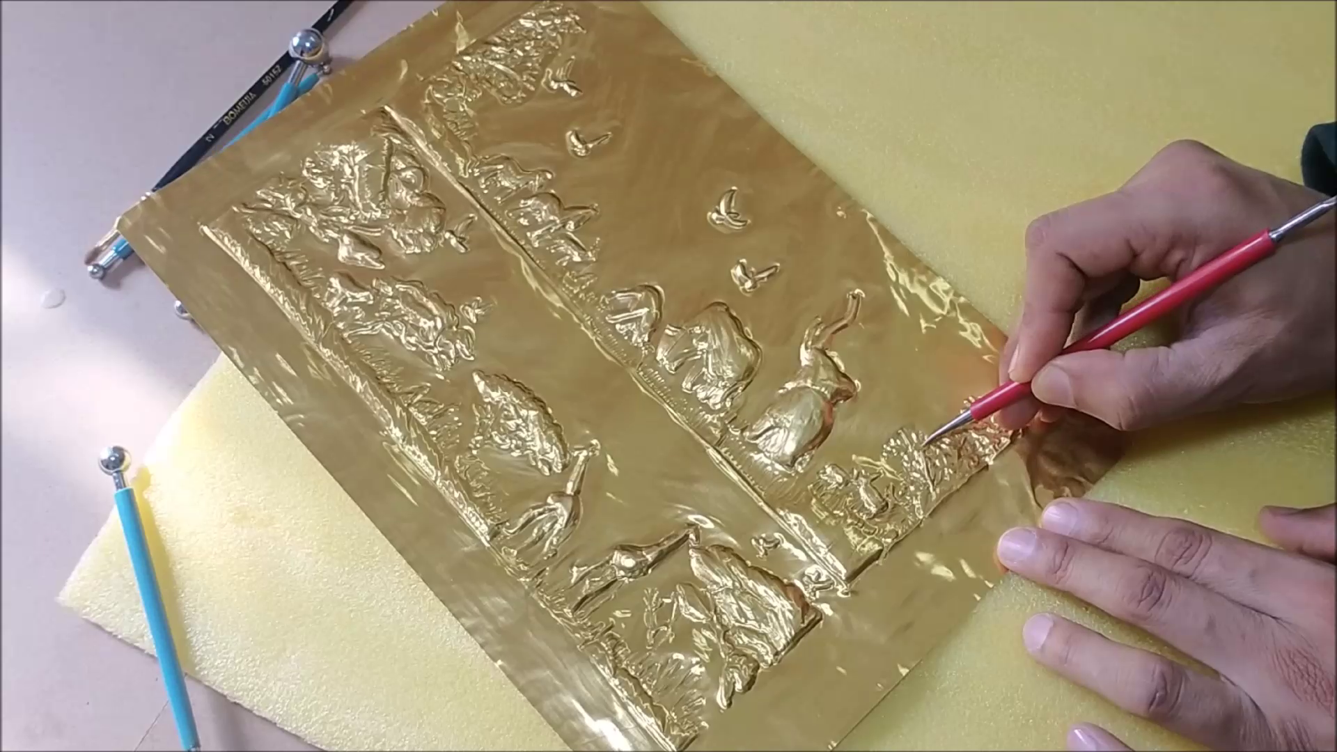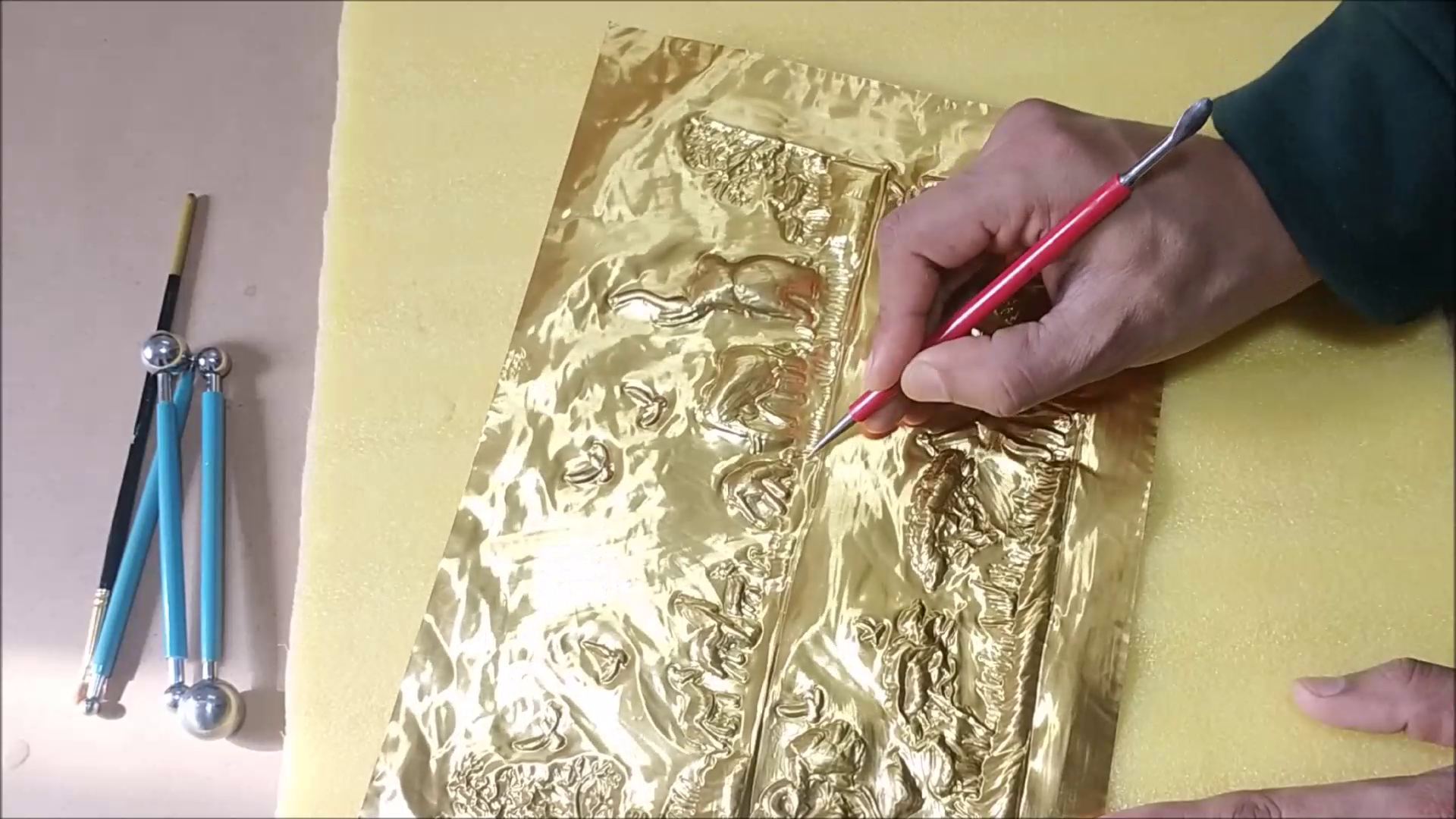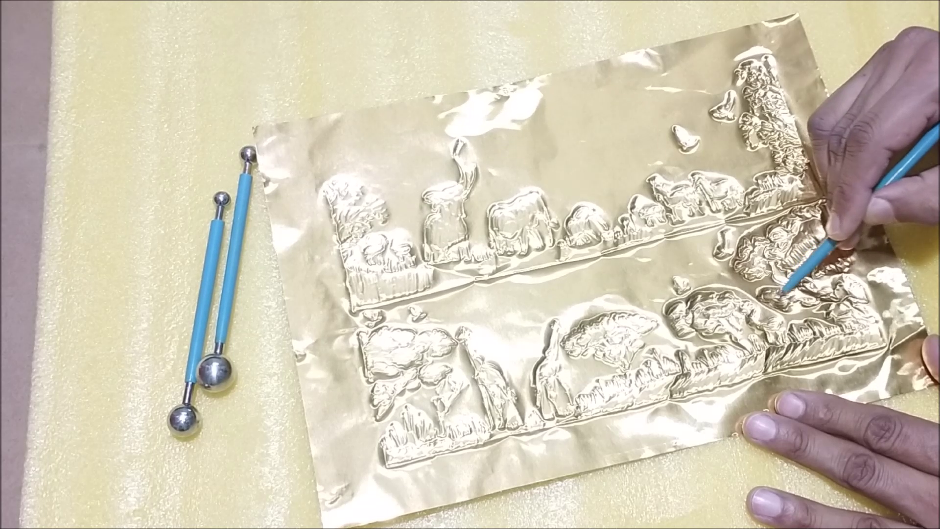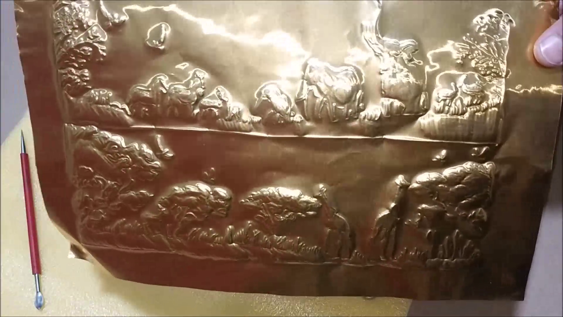 - I used lead embossing ball tools to draw design on pewter sheet. Please watch video for more detail
