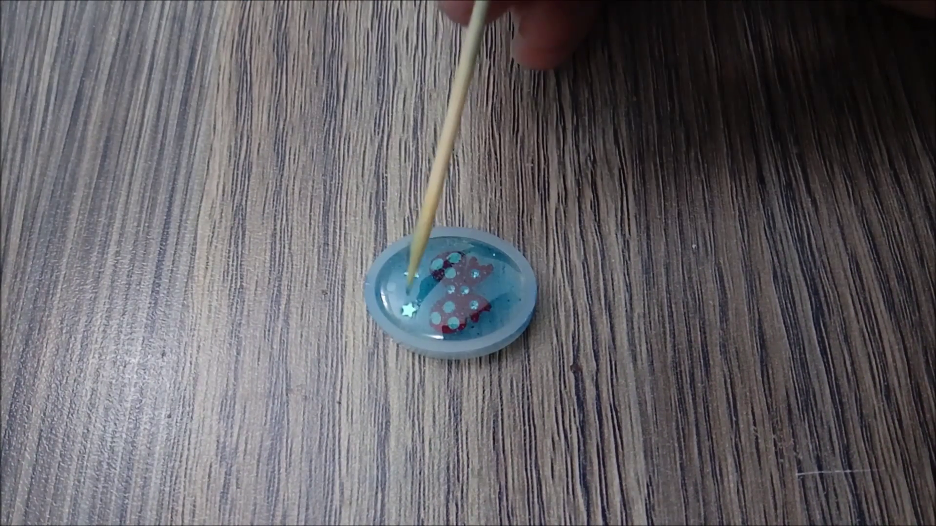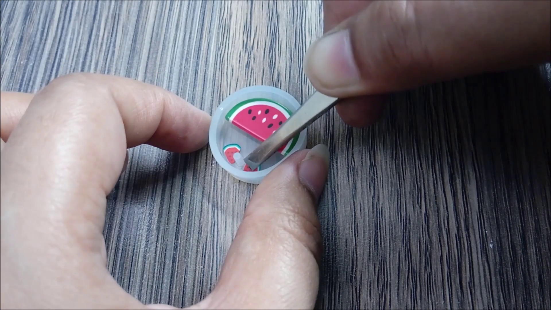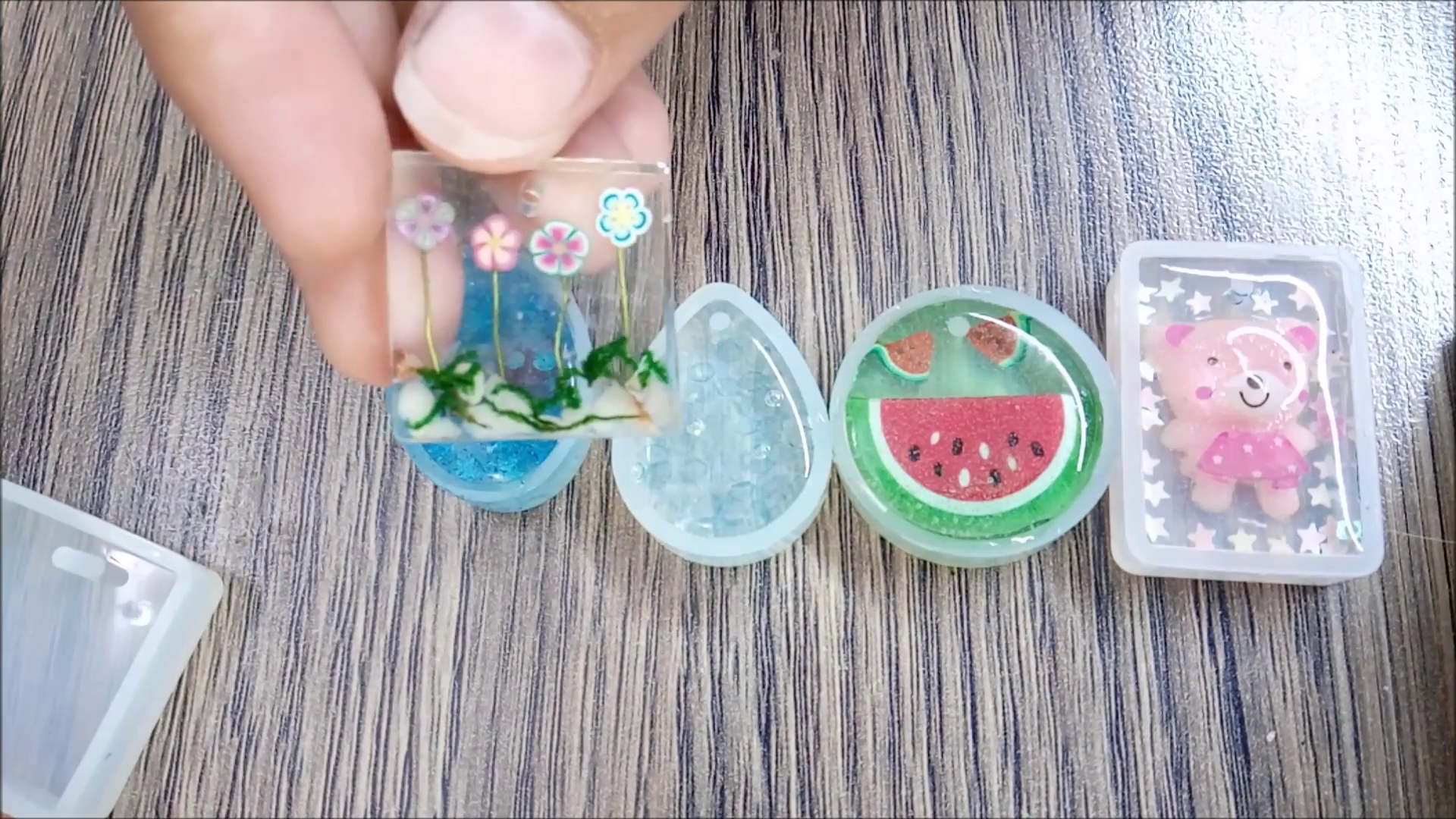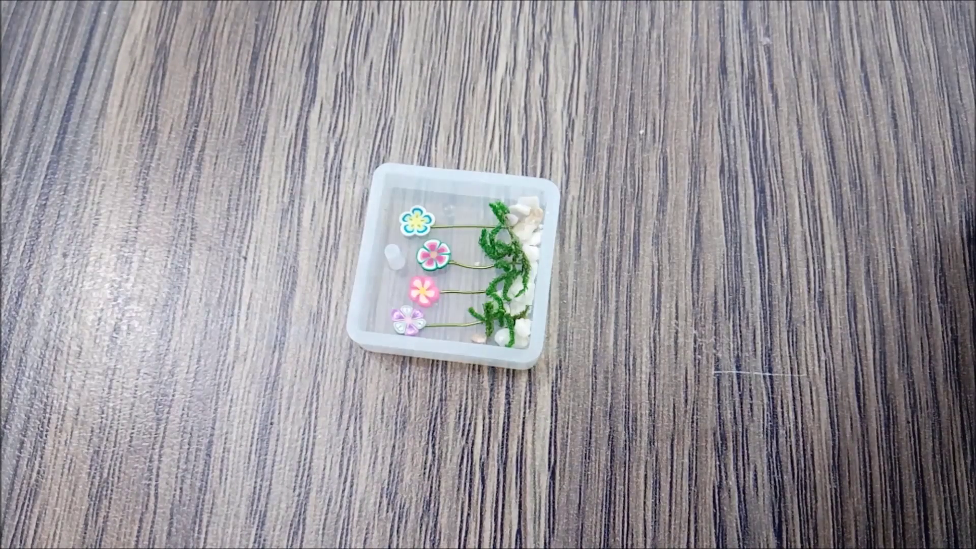 Placed plastic stuff things (flowers and fruits) on the mold. Make mixture of epoxy resin and hardener (100% epoxy resin and 50% hardener). Put Green and blue pigment on it and mix. Fill this mixture in silicone molds.