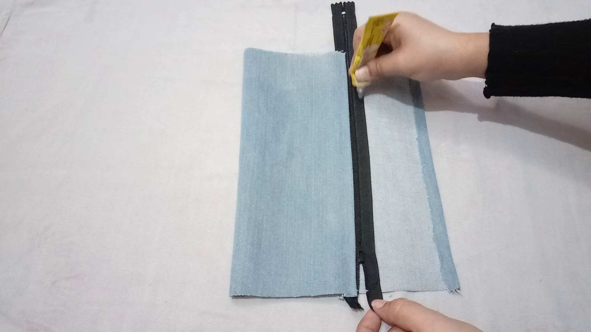 Apply all purpose adhesive on the edge of jeans cloth and fold it. Do the same method on other side of cloth. Now, take cloth zip and paste it on the cloth.