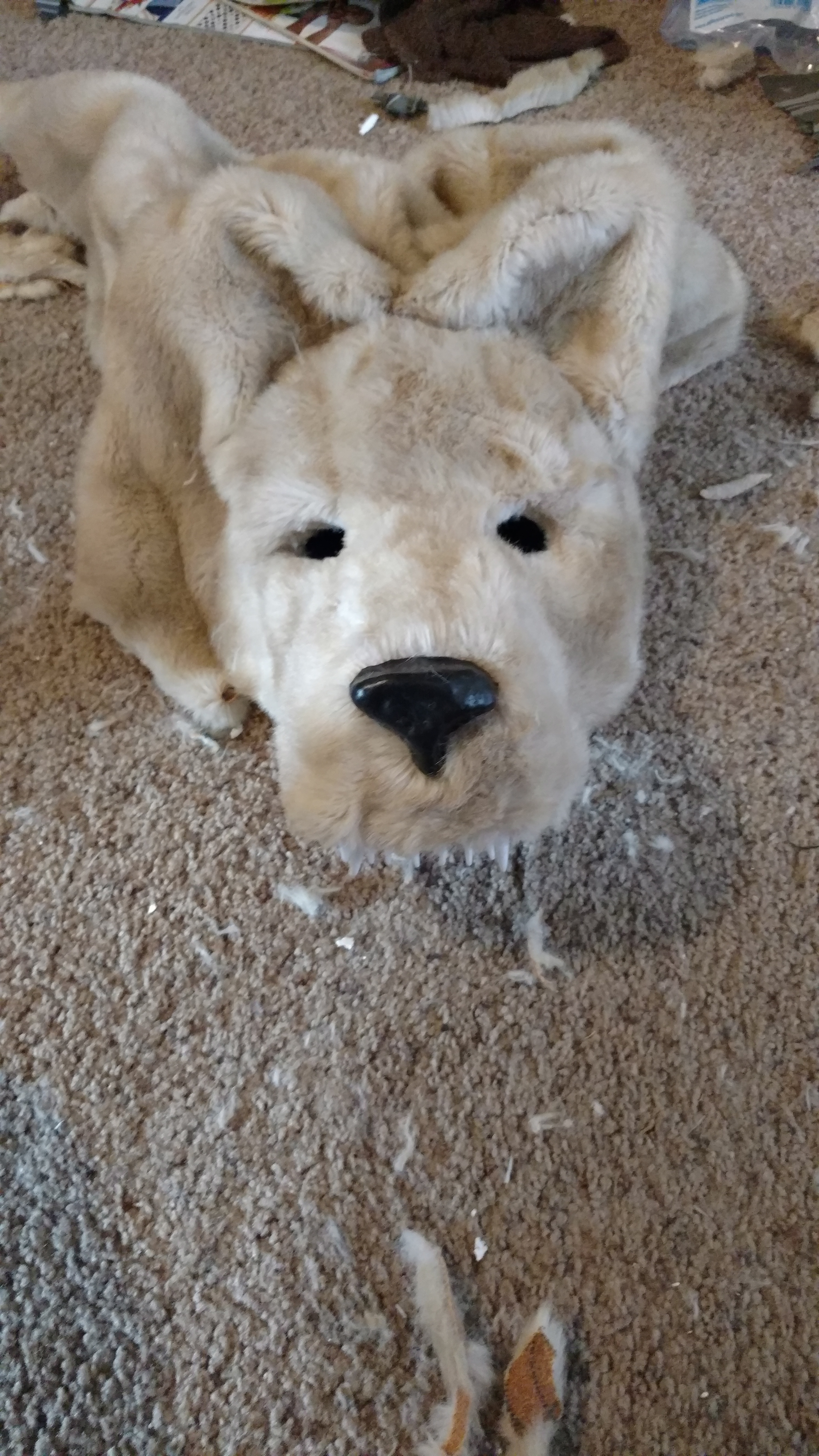 for the ears i secured the center first, then i rolled the edge of the fur under before gluing .. i tried to take a good pic of that so people could see could see what i mean. I then trimmed the fur around the eyes to increase visibility. I actually trimmed some other places (like the snout) just to give it a more convincing shape. At this point it looked like the cutest stuffed puppy dog..sooo I
