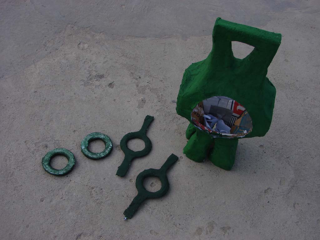 Tear lots of pieces of scrap paper into thin strips. Immerse strip and wipe off excess liquid with your fingers. Strip by strip, slowly wrap the entire power battery structure with your papier mache mixture. Pay particular attention to how you mould the strips from the handle and the feet to the side rings (see pictures). Wrap each leg, retaining the hole at the centre's bottom (this is for inserting the LED light later).