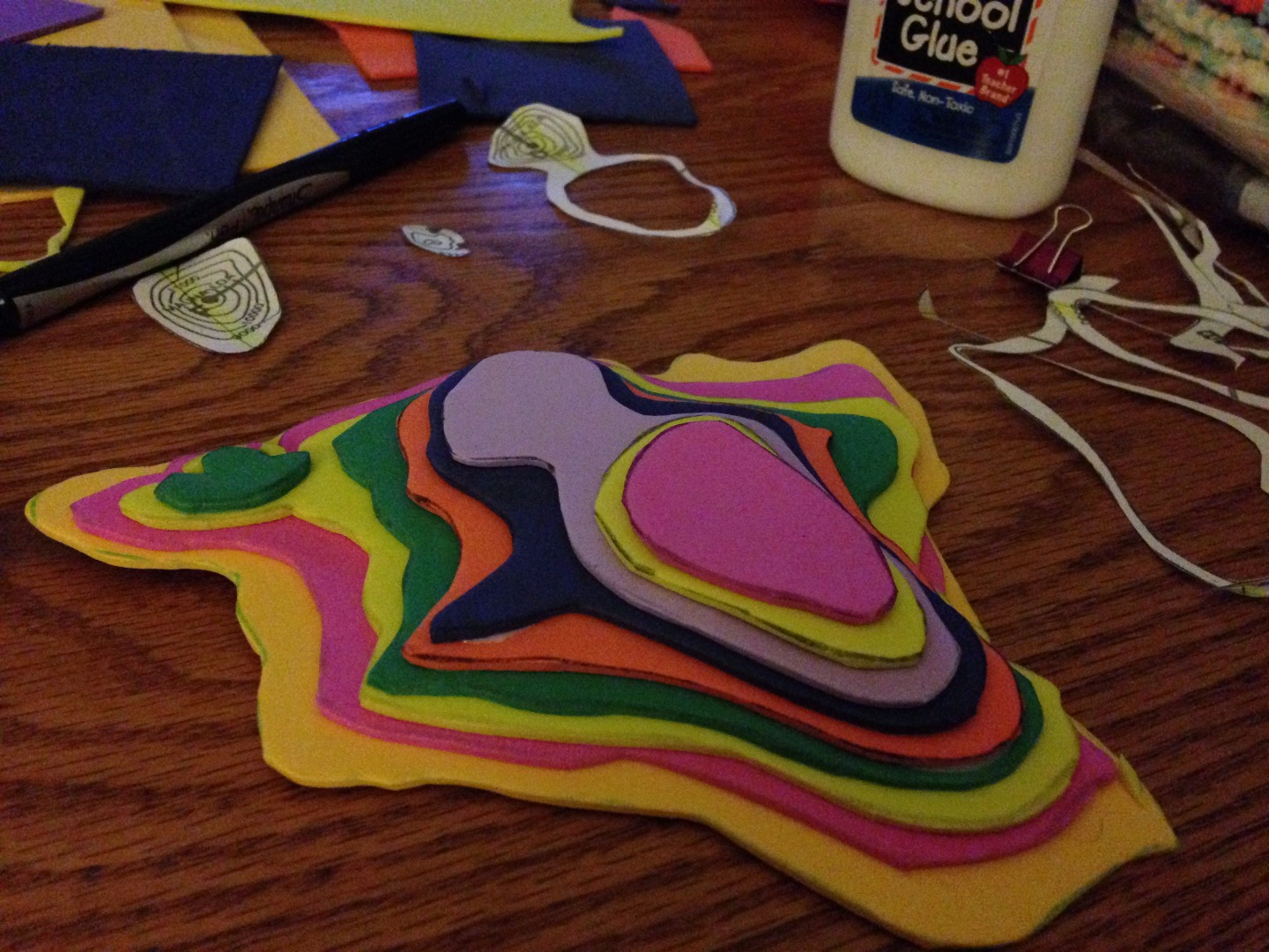 You will continue to cut, trace and glue onto your 3D model from here on out! I made each of my layers different colors so they stood out. I had 2, actually 3, hills on my topo map so I had to make sure to keep those parts of the maps to add later. See the next step on how to tackle that!