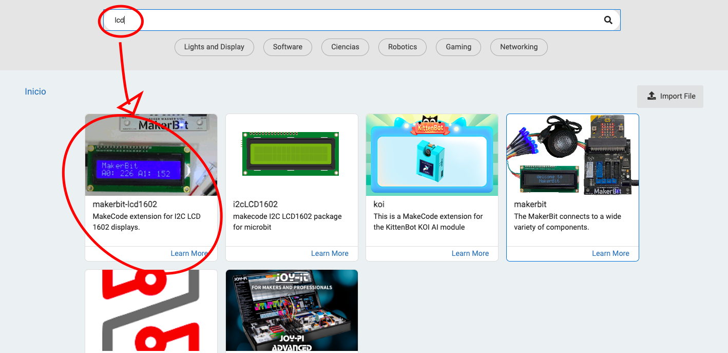 To install the LCD screen extension, enter the extensions block again and install the Maker bit LCD1602 extension.