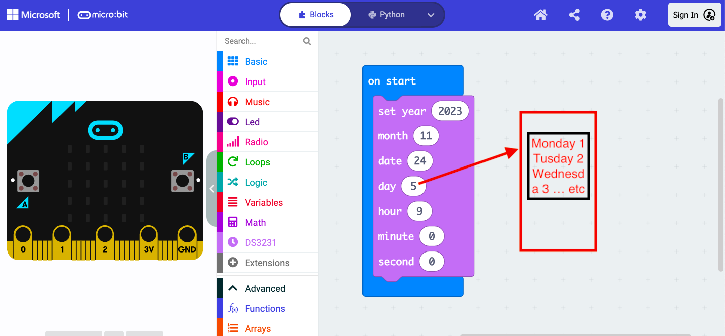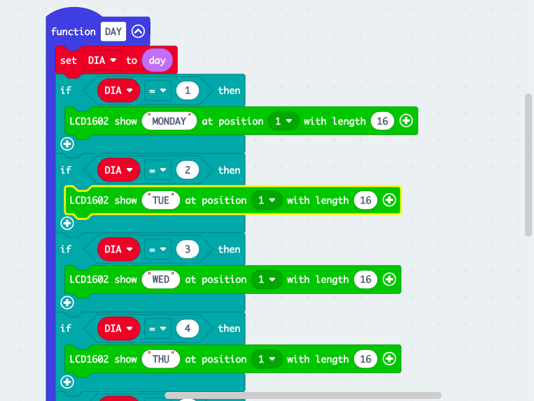First we create the function that will tell us what day of the week we are on, we store the item "day" from the rtc library in it and we establish the comparative logic: