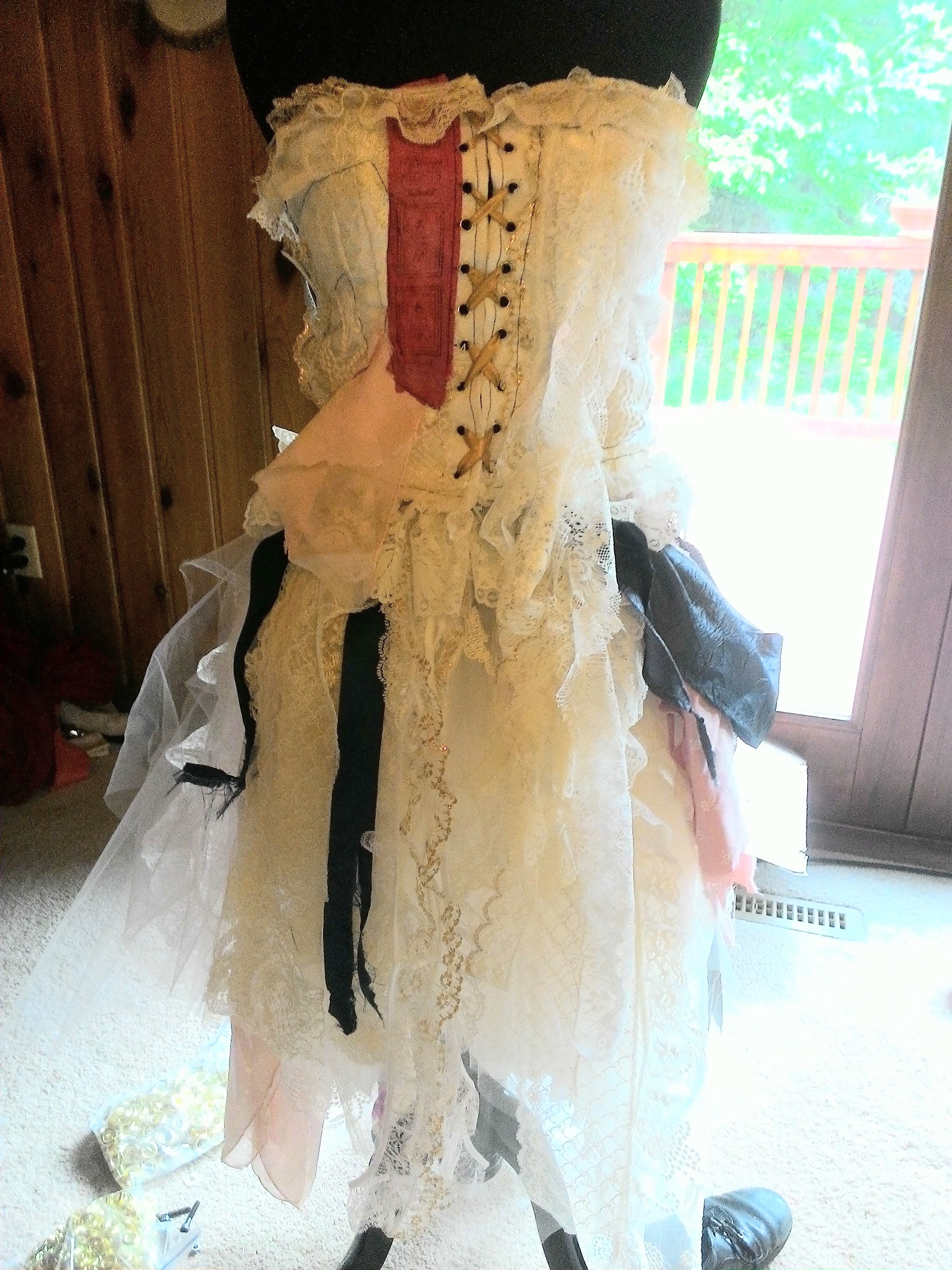The skirt was way easier to make than the bodice. I used a cheap sheet and made 2 inch pleats in it for the base of the skirt. Then I pinned a bunch of lace and random fabrics/scarfs/whatever I could find, to the skirt, and sewed it to the base skirt. Be careful sewing this because after a while it's hard to see the needles. I broke a couple of needles on my machine sewing the skirt.