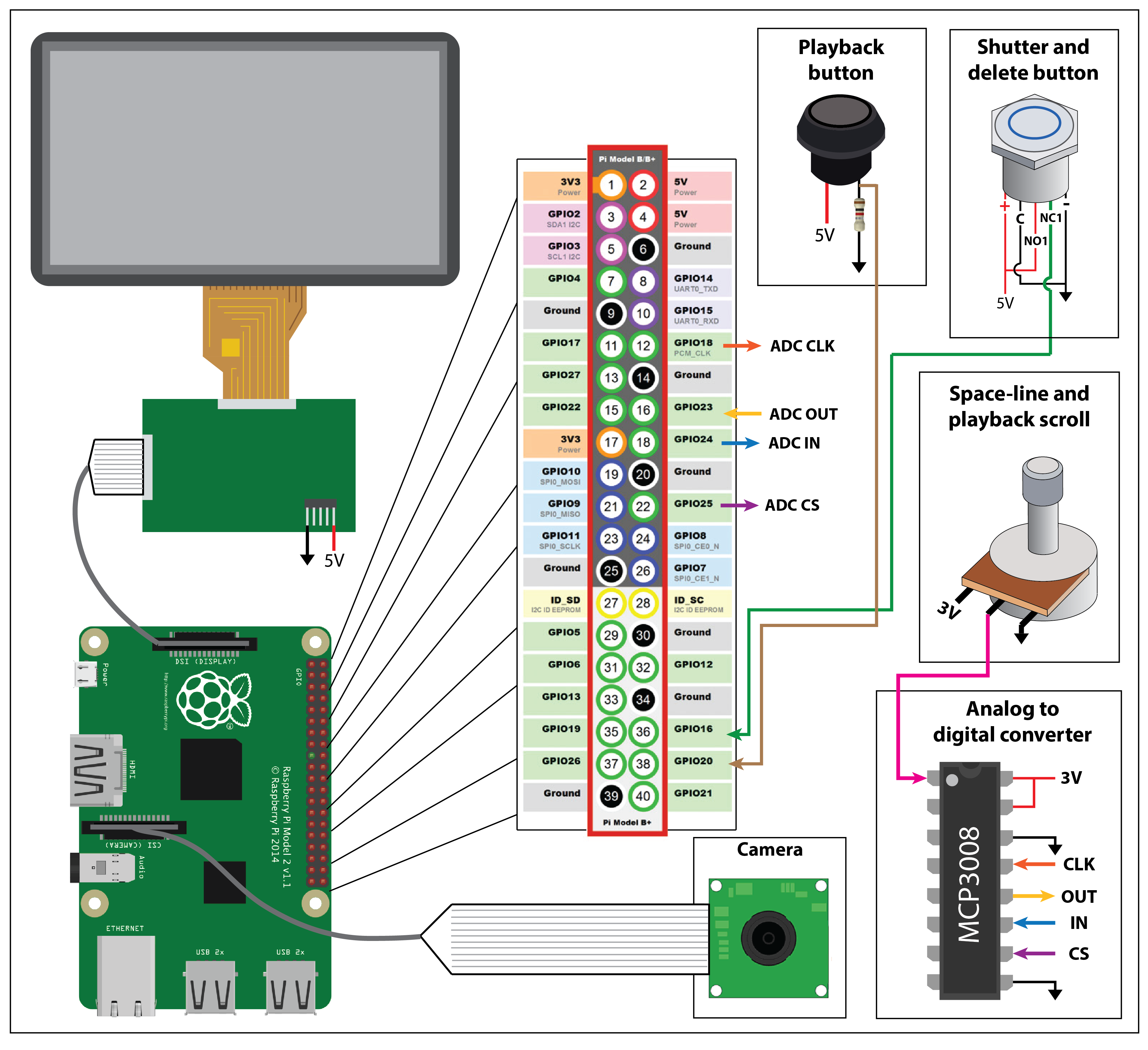 GPIO.setmode(GPIO.BCM) GPIO.setwarnings(False) GPIO.setup(16,GPIO.IN) # shutter switch pin GPIO.setup(20,GPIO.IN) # playback switch pin<p>SPICLK = 18 # ADC clock SPIMISO = 23 # ADC data out SPIMOSI = 24 # ADC control in SPICS = 25 # ACD CS</p><p>GPIO.setup(SPIMOSI, GPIO.OUT) GPIO.setup(SPIMISO, GPIO.IN) GPIO.setup(SPICLK, GPIO.OUT) GPIO.setup(SPICS, GPIO.OUT)</p><p>buttonState = 1 # initalize state of shutter switch prevState = 0 # initalize previous state of shutter switch buttonState2 = 0 # initalize state of playback switch prevState2 = 0 # initalize previous state of playback switch foldOut = '/home/pi/Desktop/spaceTimeCode/Images/' # folder images are saved to