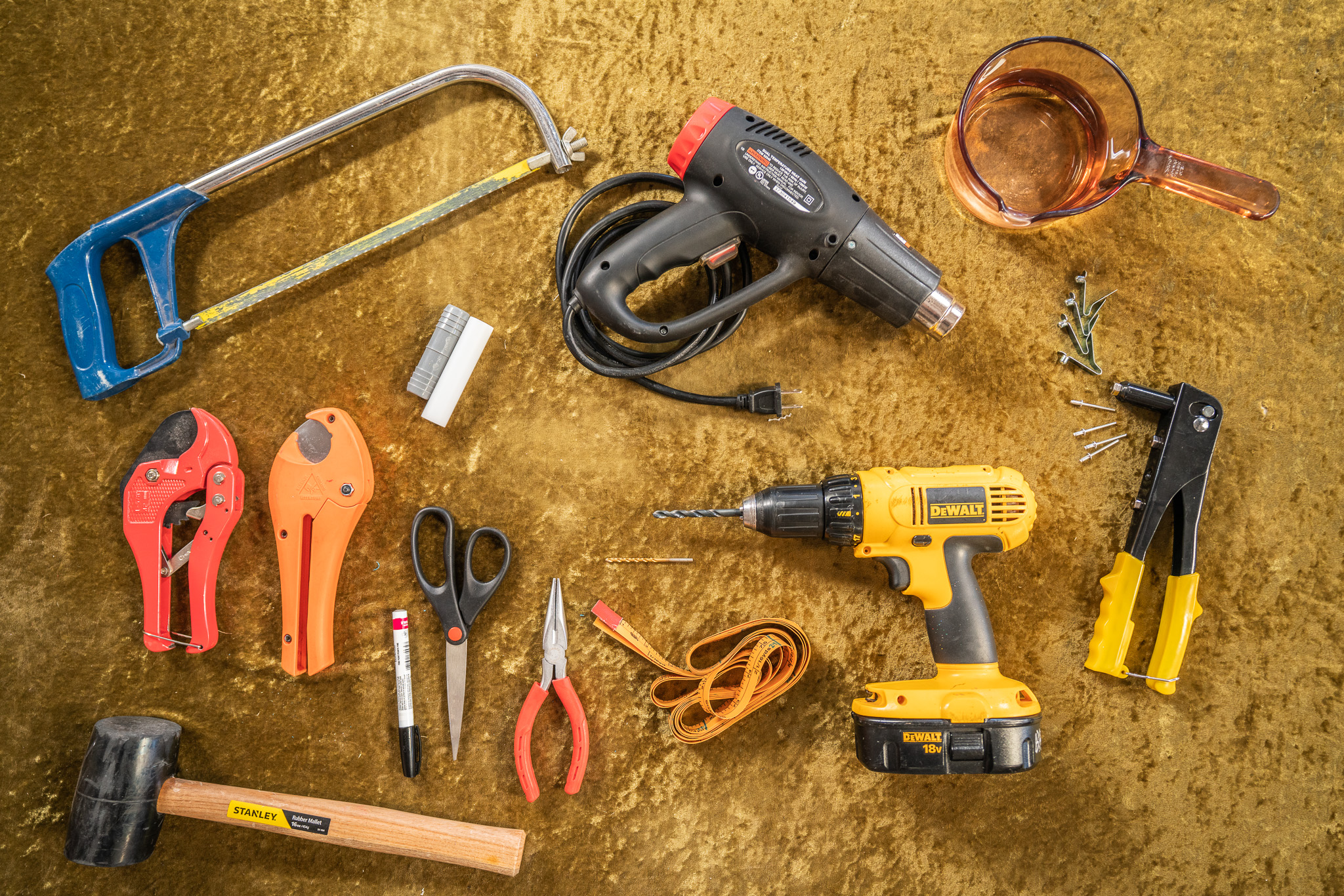 Rivets and rivet gun are best bought at Harbor Freight Tools, it's the cheapest place for them. You can also get the specific size rivets needed for this project from the link above - The Spinsterz.