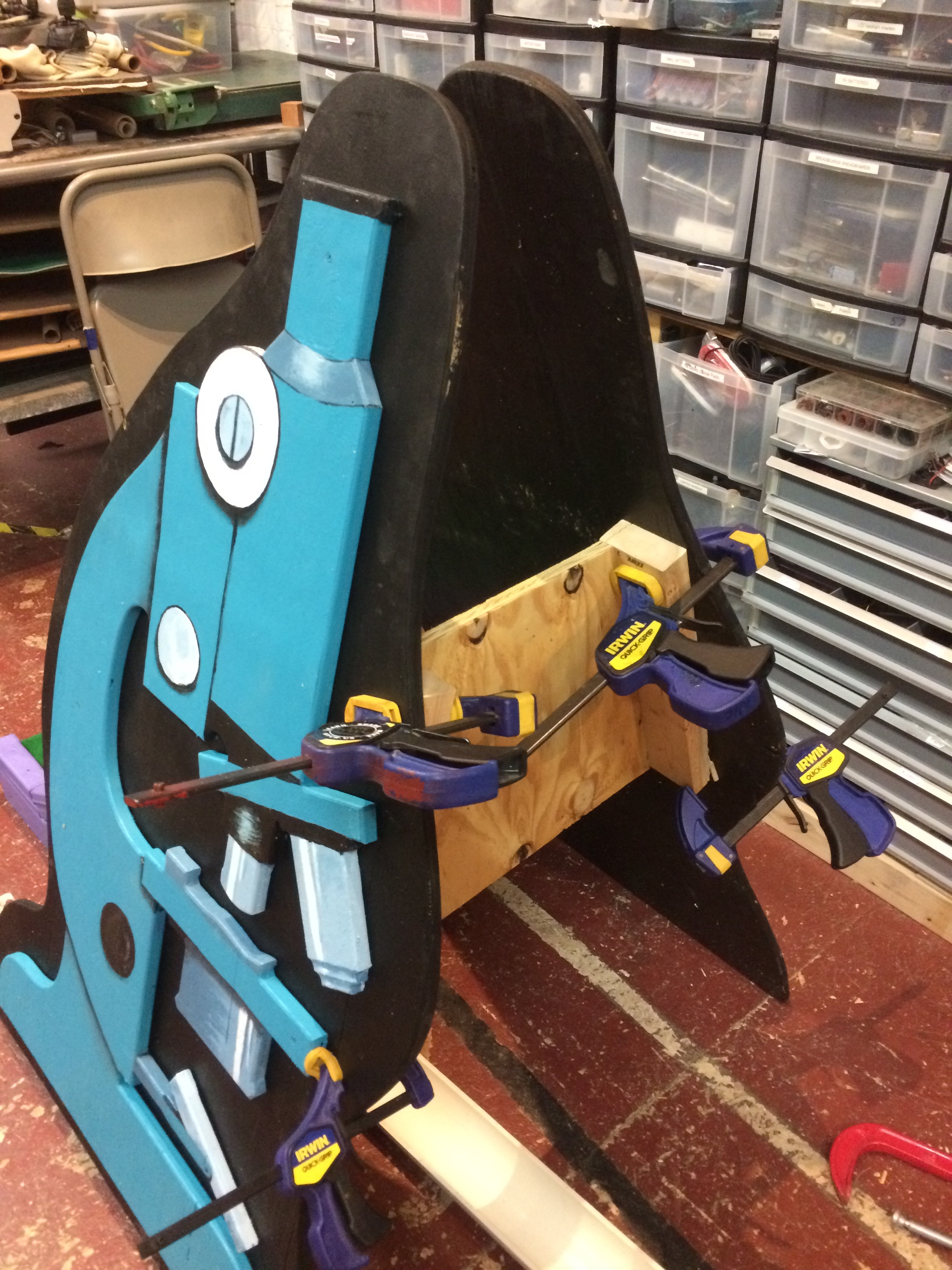We covered our space in plastic drop cloth, and used a ladder to prop up the microscope pieces, which Colleen expertly painted. The obstacles and backboards were painted solid colors using two coats of exterior paint, and predrilled for attaching to the playing field.