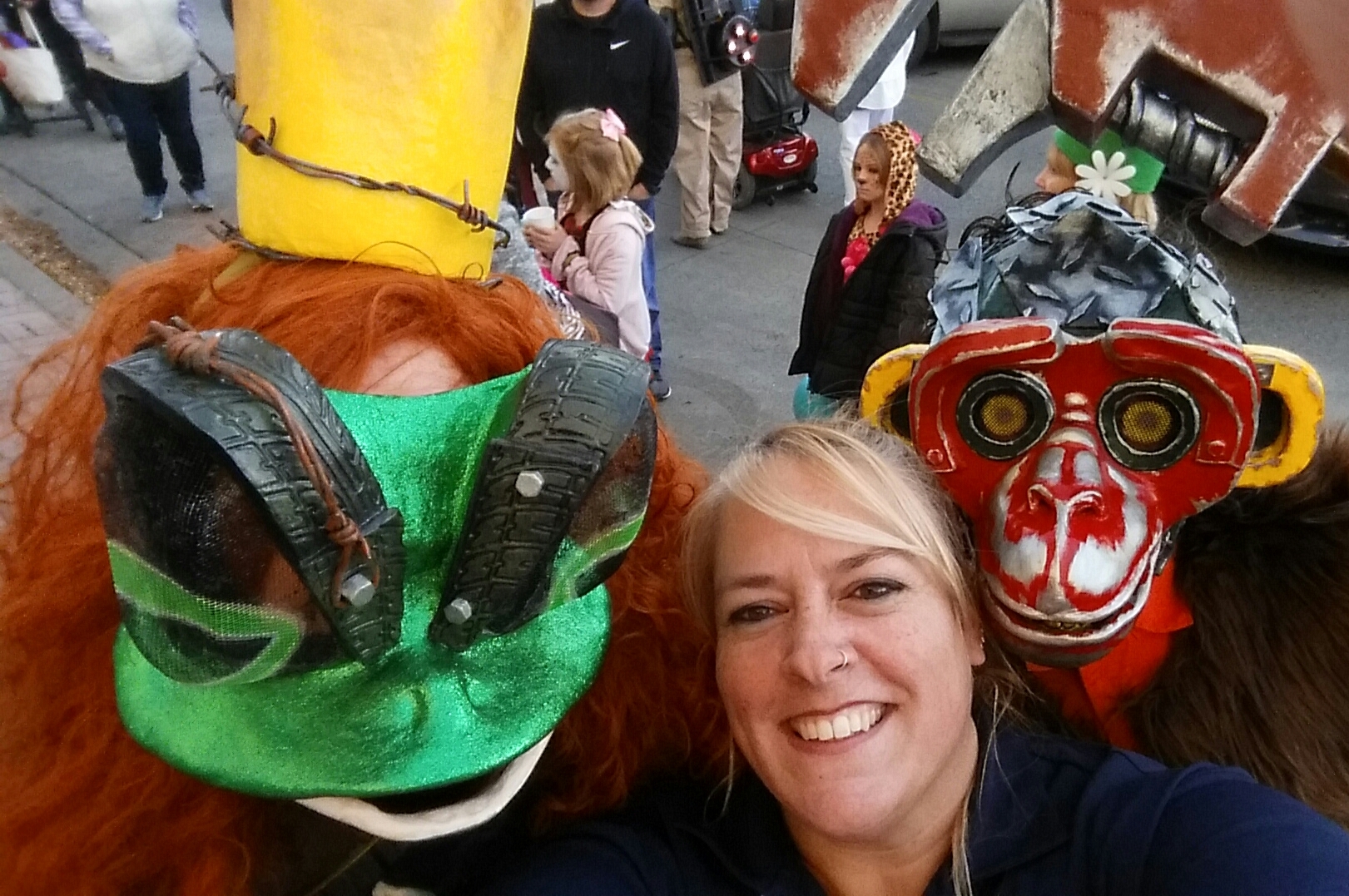 The green part was covered with several coats of a green glitter craft paint, which was pretty easy. The throat took more attention, because the white parts had to be dirtied and chipped with lots of steel showing through, but it's a process that is familiar to me now after making the Grease Monkey mask!