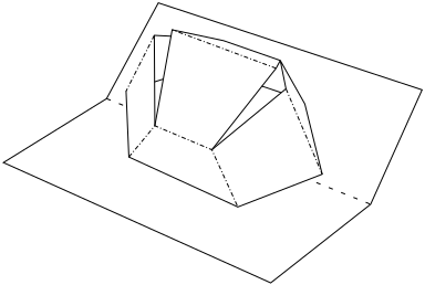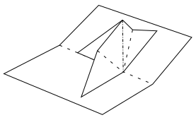 The 'energy' which opens the shapes comes from the folds. When a structure is added to a fold, new folds are introduced. These folds can again act as the 'energy' to pop-up other structures. Two types of structures can be distinguished, a structure created by a fold which crosses the base fold (v-fold) and structures created by a parallel fold. By smart combinations of both types of fold, folds in any direction in the 3D space can be created at any location you desire.