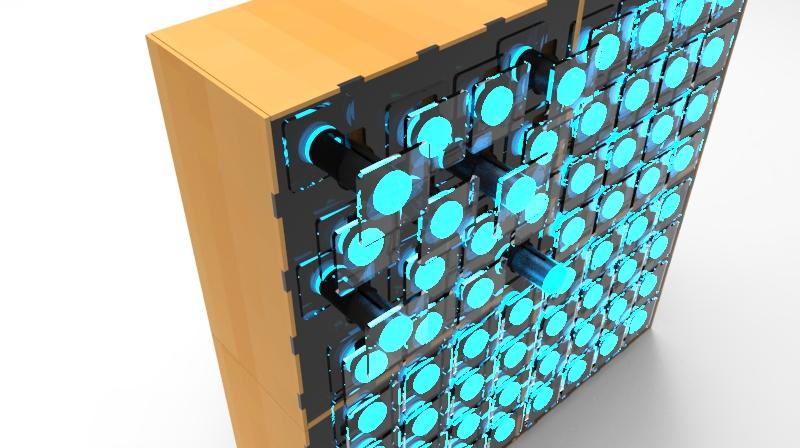 Initially, a CAD model was designed which comprised of four individual tiles. The RGB LEDs would be attached at the end of cylinders which would be can be moved forward and backward using a servo motor. To convert the rotational movement of the Servos to linear movement, a rack and pinion mechanism is used.