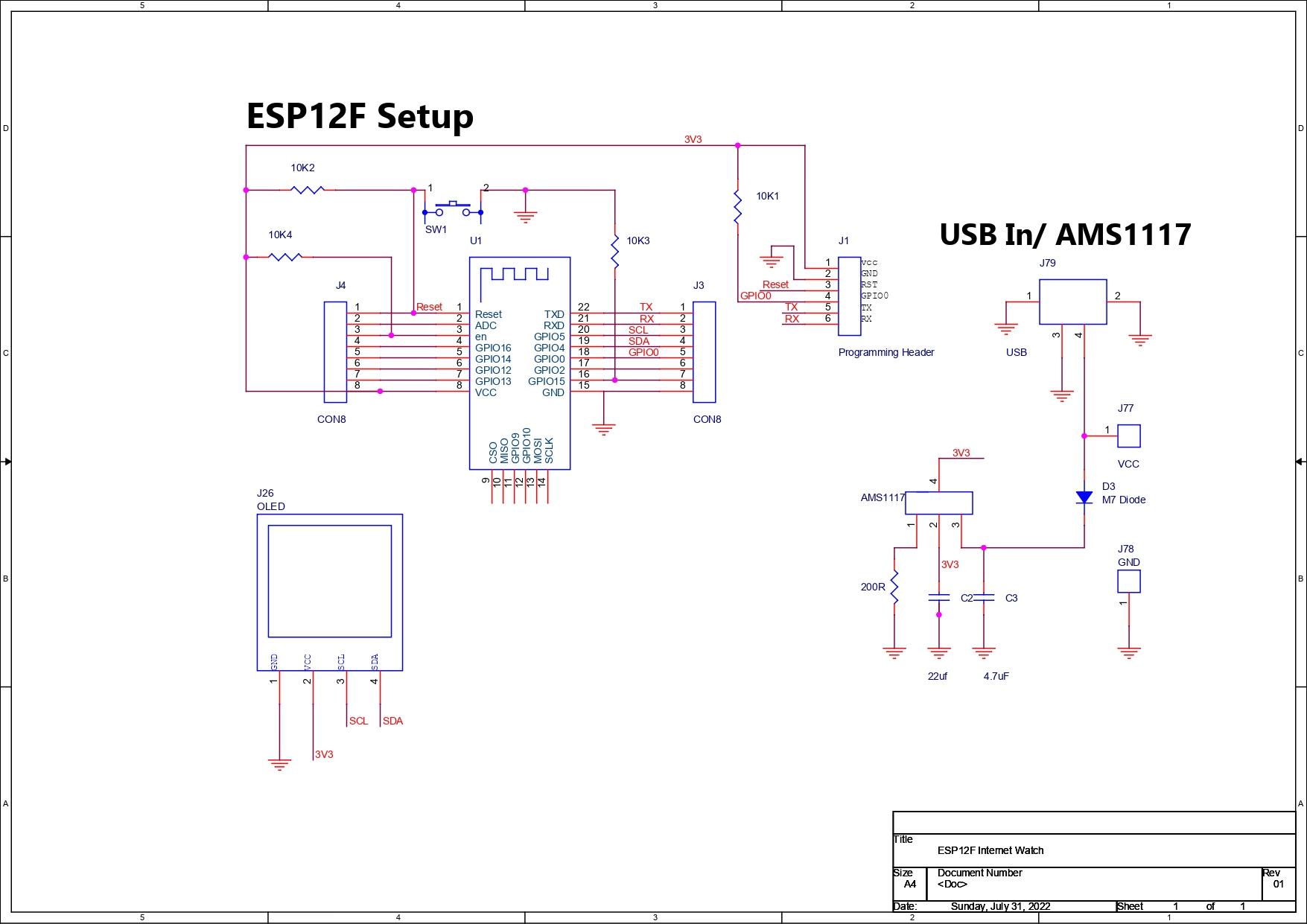 Here's the schematic that was used to prepare the circuit, It has an ESP12F Minimal Setup that is connected with the OLED Display.