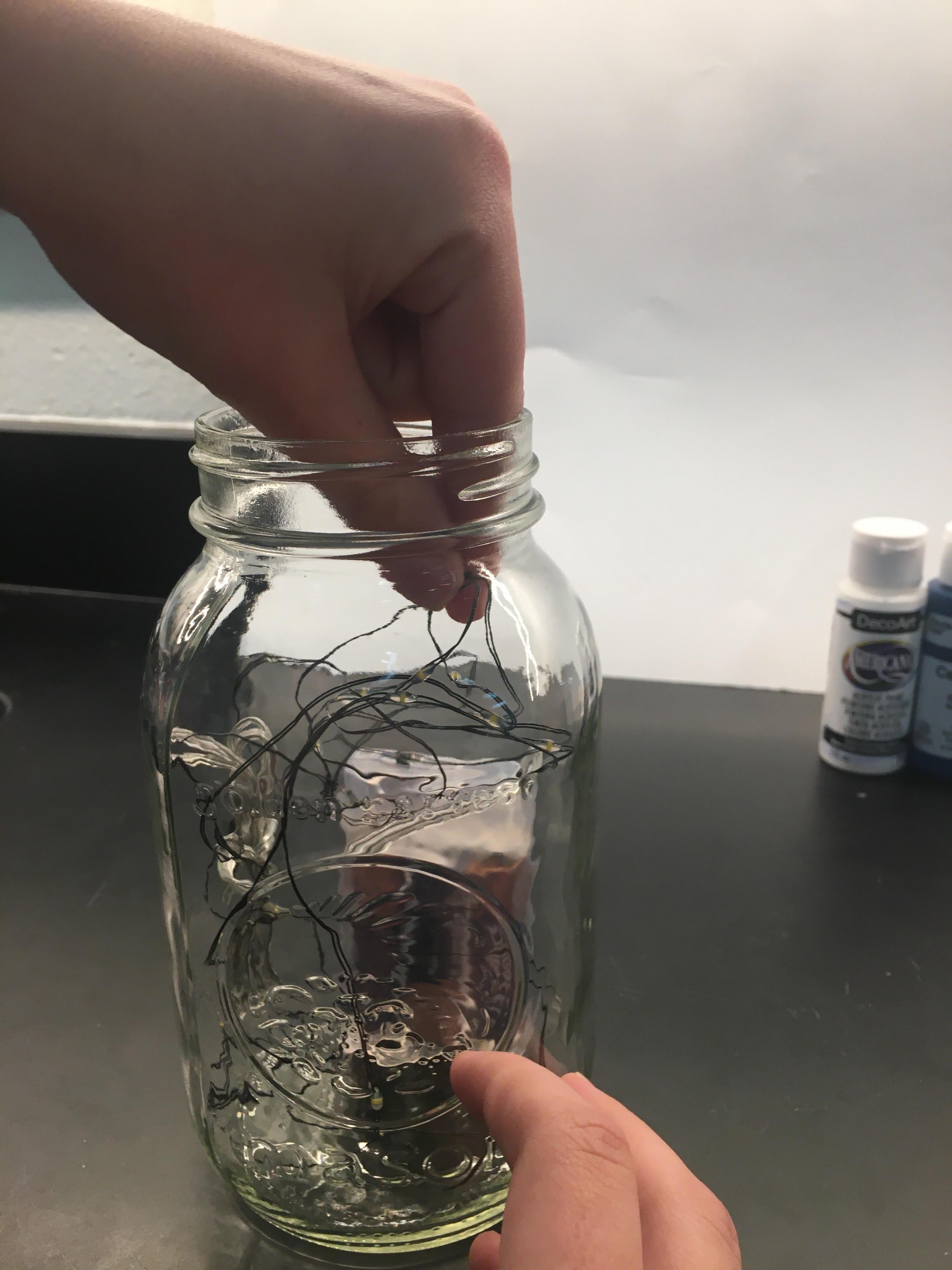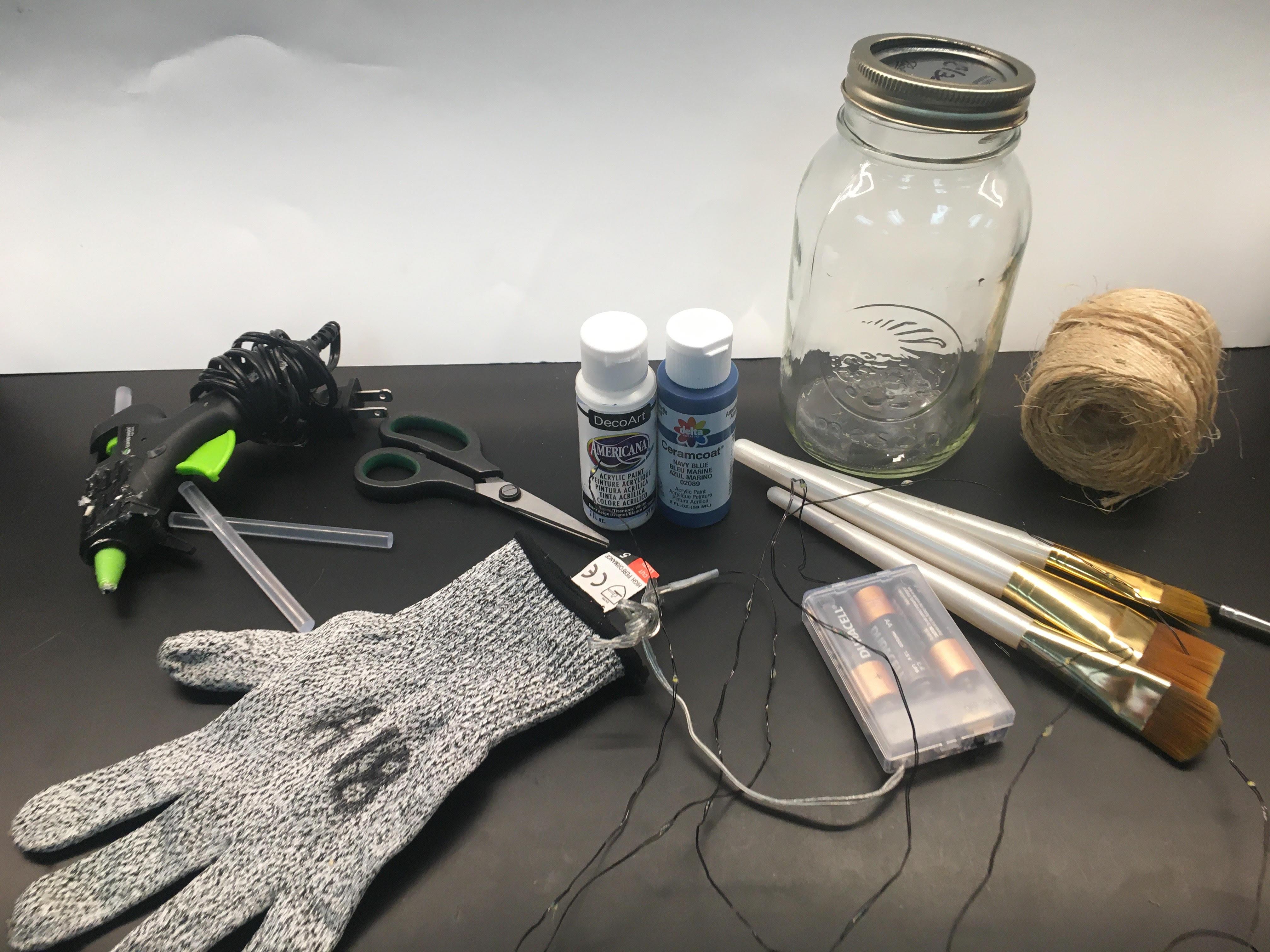 First get out a jar, twinkle lights, paint, paint brushes, scissors, a hot glue gun, and twine.