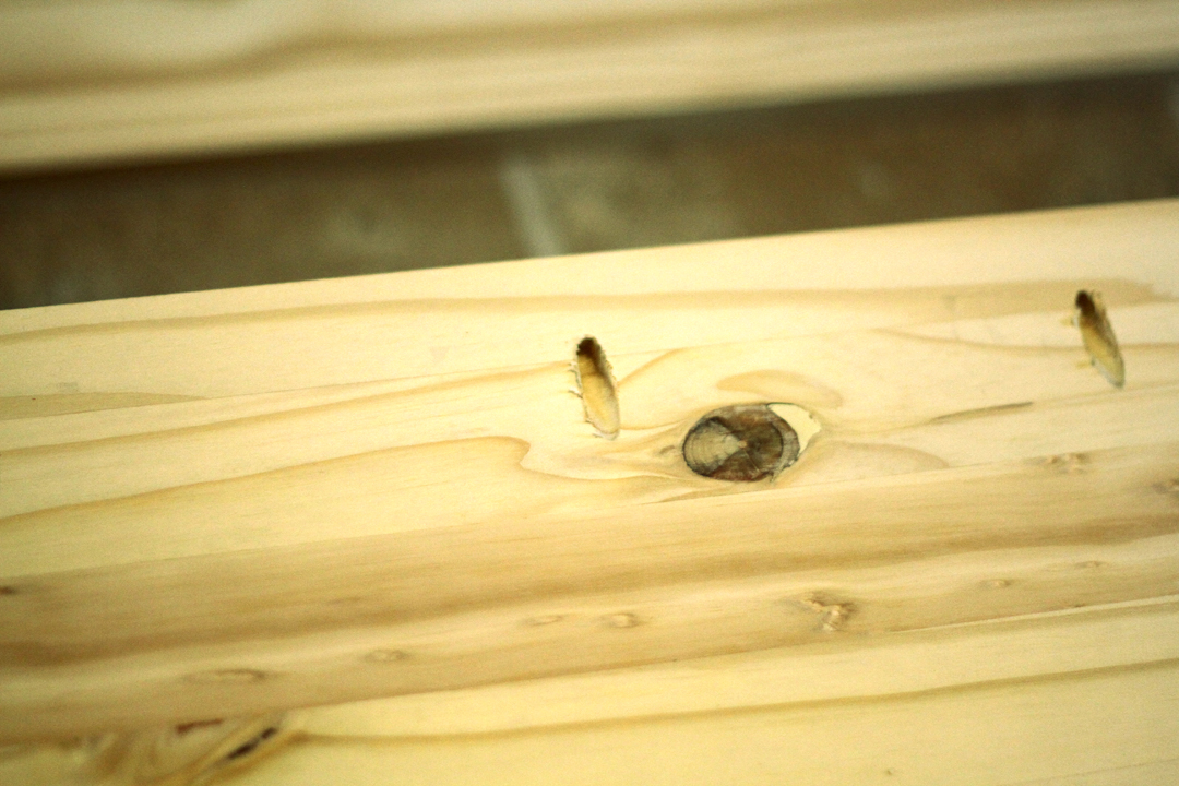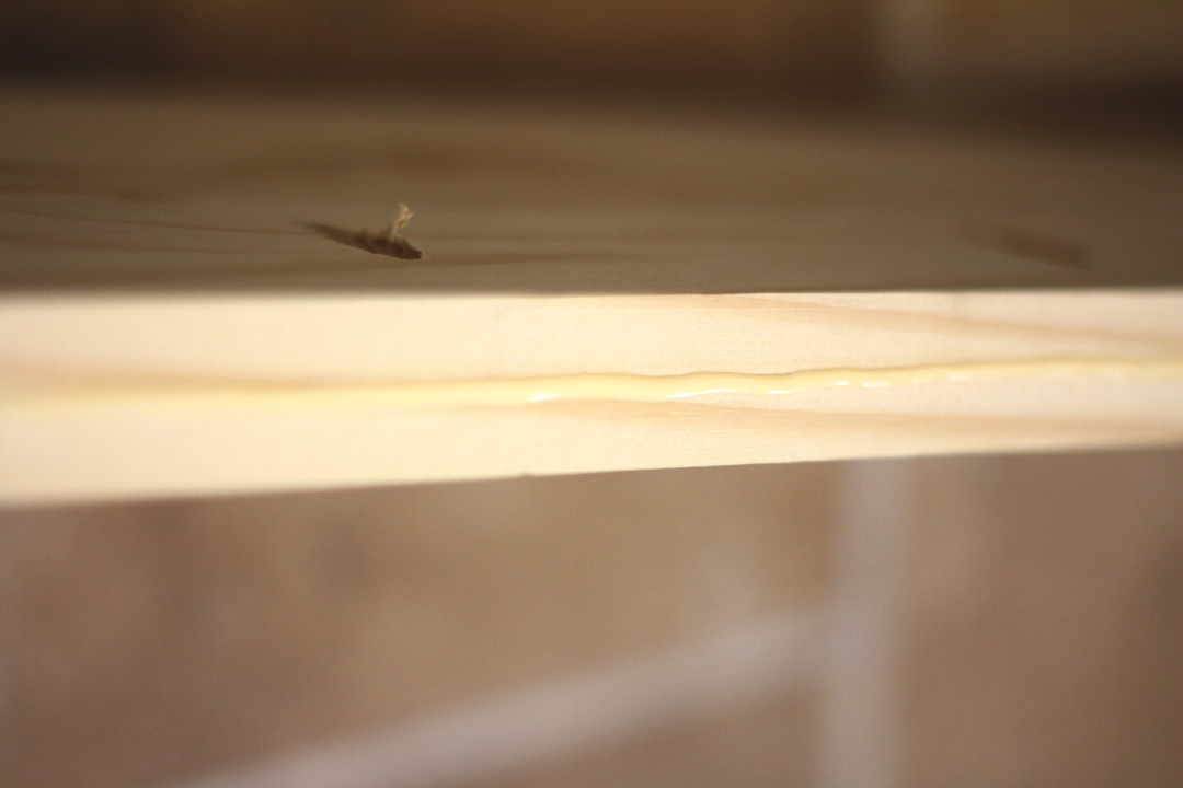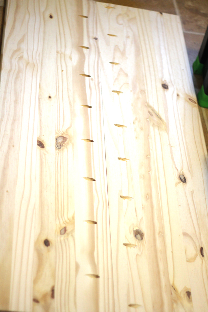 I made pocket holes down both pieces of the pine stair treads, about six to eight inches apart. You don't want them to line up, so stagger them as you can see in the picture. Liberally glue the joint and screw the two pieces together. I had the pieces on a flat floor and knelt on them as I screwed them together to keep them flat and flush. I also alternated screwing one side and then another.