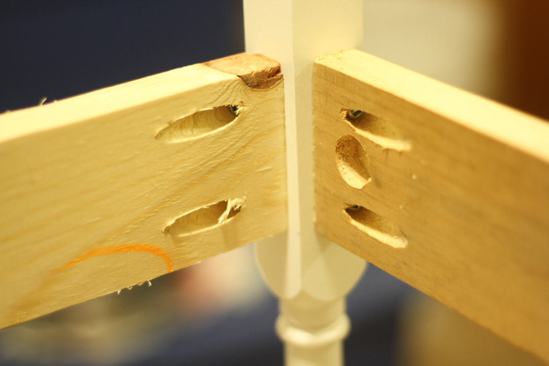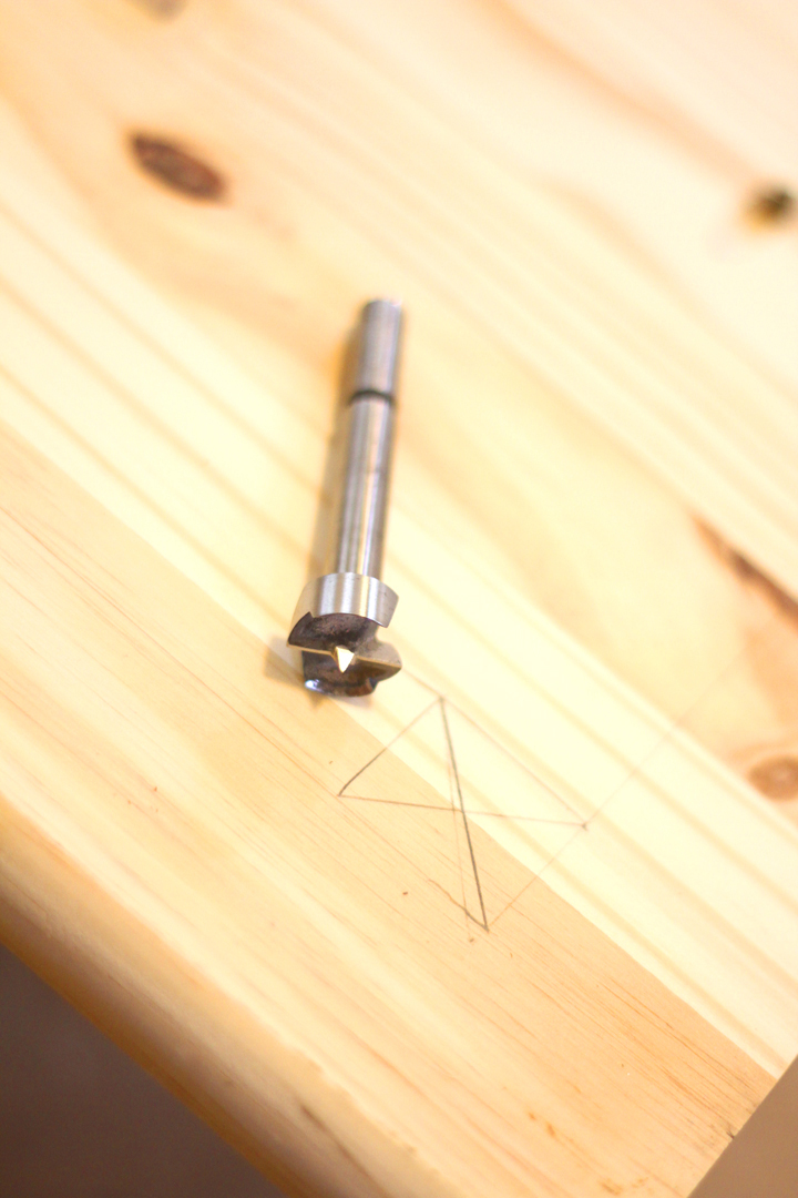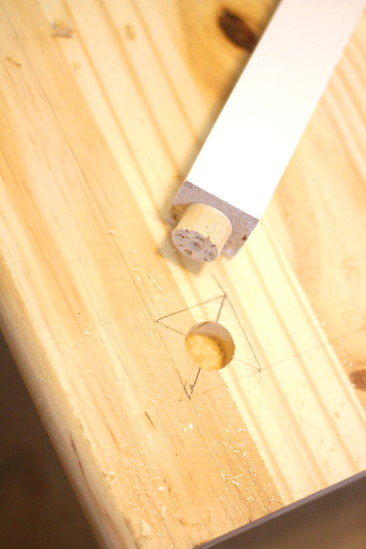 At the corners I traced the baluster and marked the center with an X. Using a appropriately sized drill bit (here I used a 3/4" forstner style bit) to sink in the baluster's tenon. Make sure not to drill all of the way through!