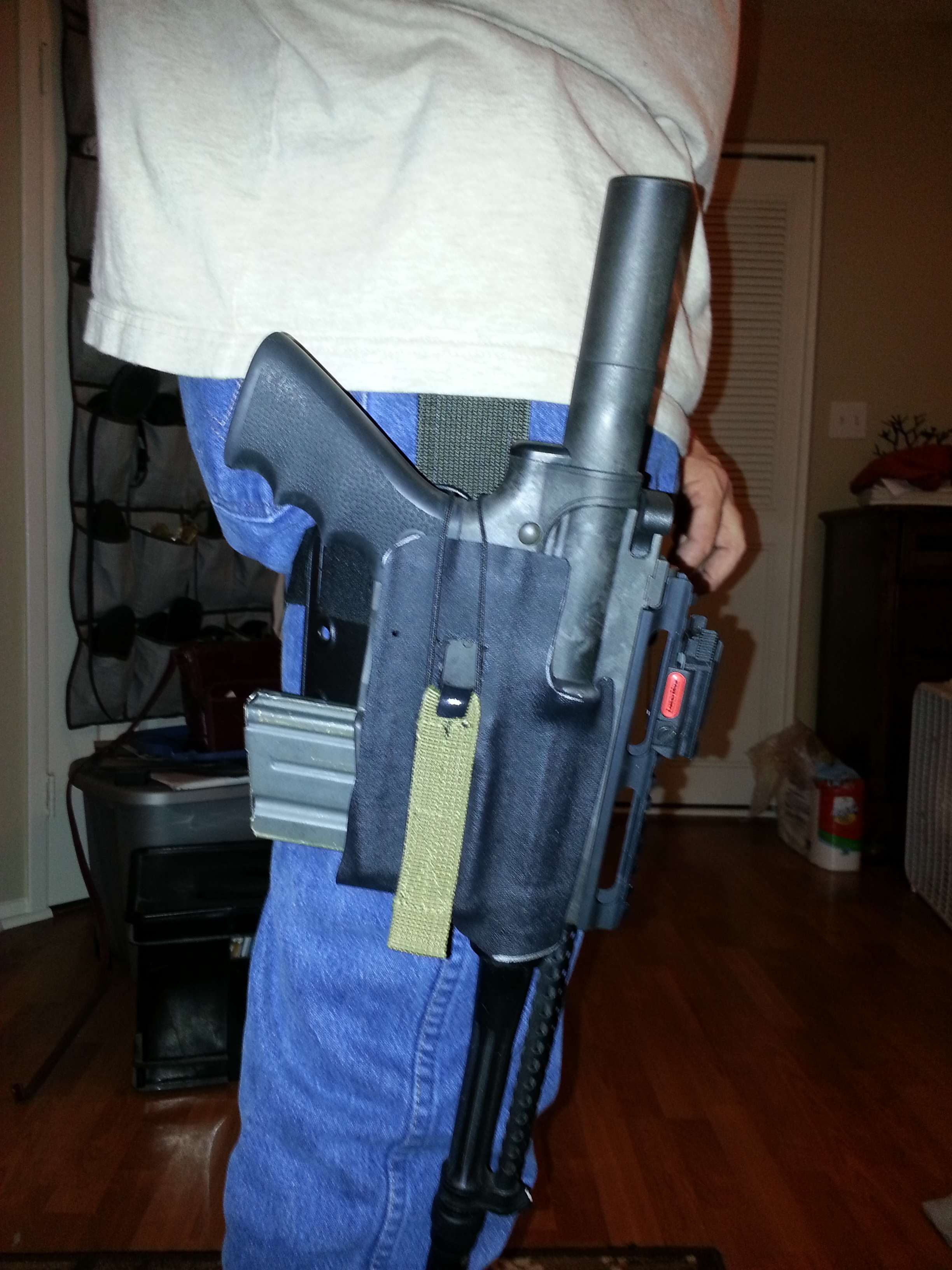 I strapped it on to get a feel for how good or bad this was actually going to be. Kydex comes in different thicknesses, and I chose some in the middle of the road. It is a bit too thin to securely hold the pistol during normal activity without a thumb break, but for a weapon of this size that is to be expected. But the final position is perfect, falls right to my hand for easy removal/replacing, doesn't impeded active movement, carries the weight so well you hardly know it is there.