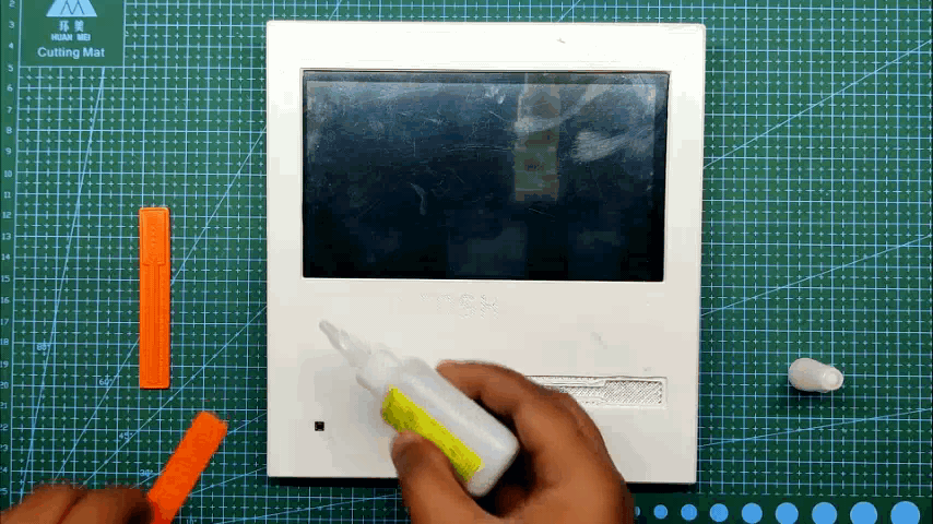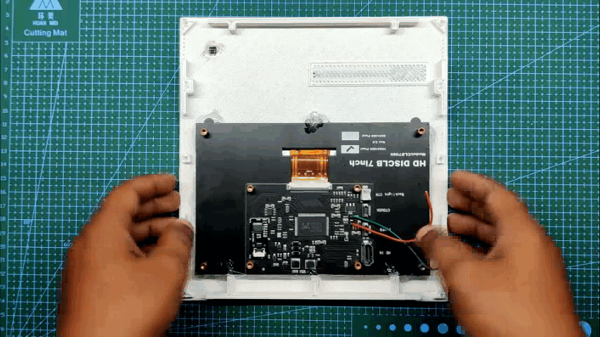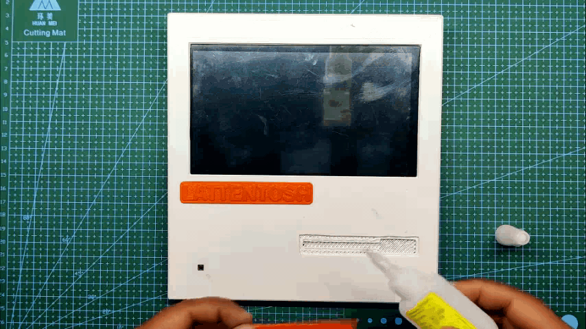 - We add the 7-Inch LCD Display on the 3D Printed front lid cover by using some hot glue, we add hot glue on each corner of the display, which will hold it in place.