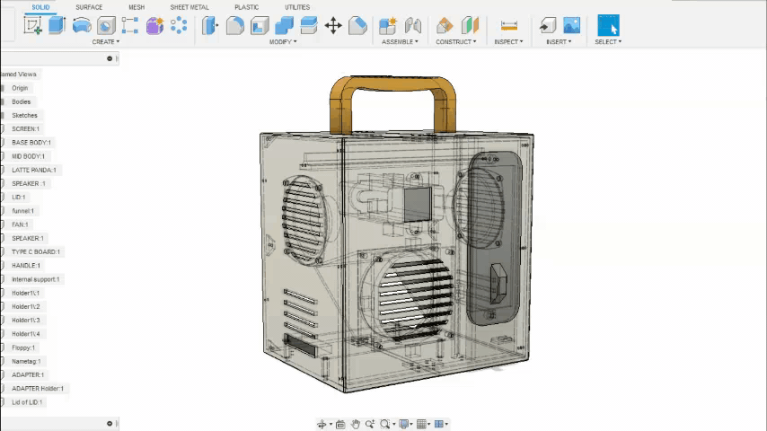 The Main Model consists of a total of 13 parts that are the base body, middle body, back lid, funnel, handle, three internal supporting pillars, four middle body holders, logo, false floppy add-on, funnel, adaptor holder, and lid of the lid.