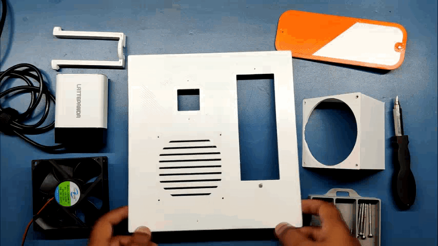 The back lid contains the DC Fan with a funnel for airflow and the Latte Panda's adaptor holder, it also contains the lid of the lid which is a part that we add to the back lid, it can be opened to see what's happening inside the PC.