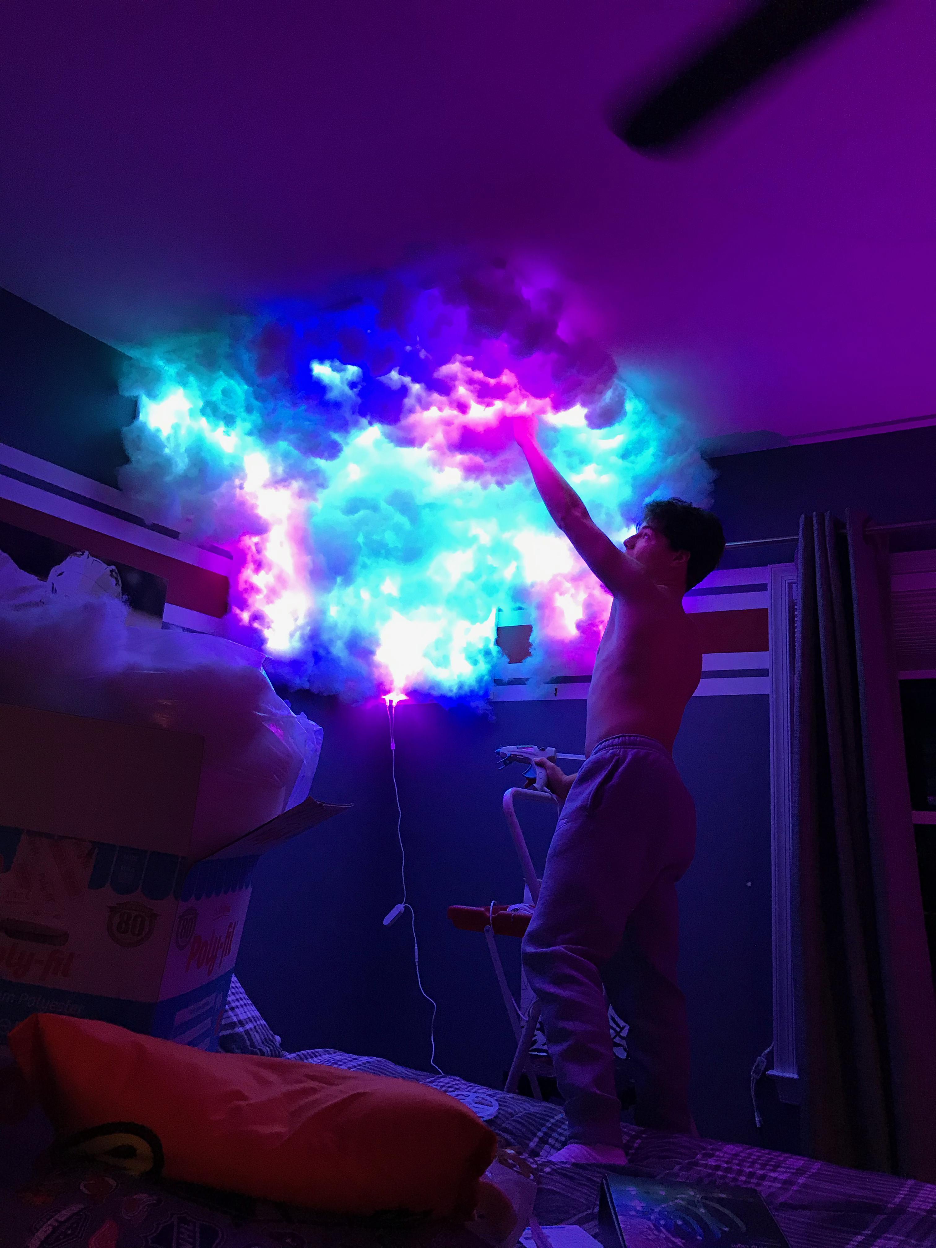 This is an easy DIY project I helped my teenage son with for a lighting effect in his bedroom. We've created this in a way that does NOT damage your ceiling or walls. It can be easily removed - making it a very parent-friendly addition to any child or teen's bedroom. Using styrofoam boards attached with command strips (so they can be easily removed later) you can glue fiber fill to the boards, giving it a cloud-like effect - especially since it will be back-lit by LED lights! We were able to complete this for under $100 and in less than 2 hours. Our son leaves this on 24/7 in sound-activated mode, so it's a night-light at night when he's sleeping, but when the music is blasting, it's a lighting/storm effect that illuminates his entire room! (see video at the end)