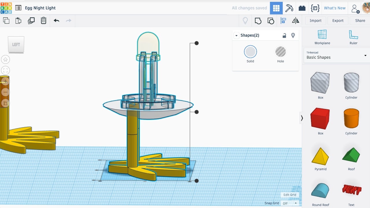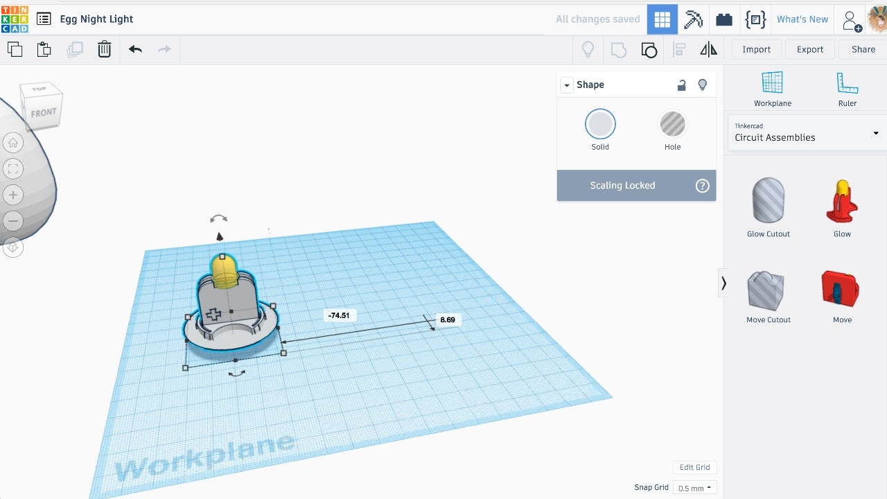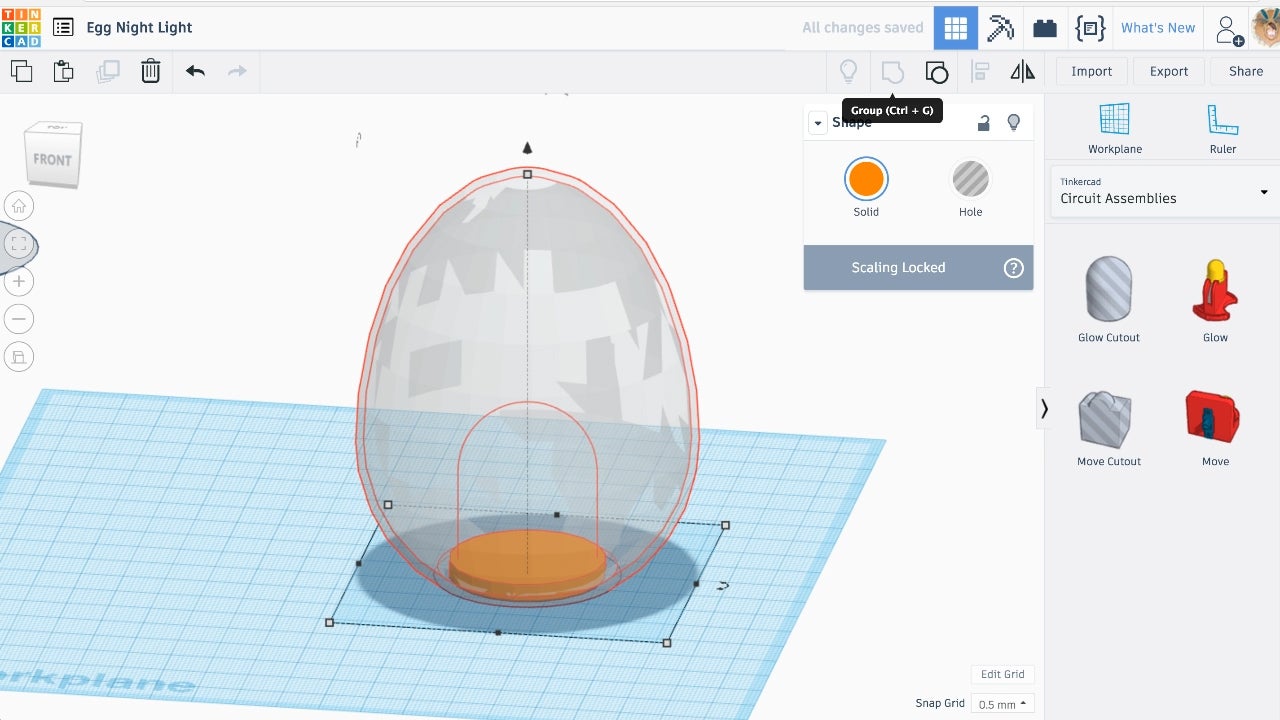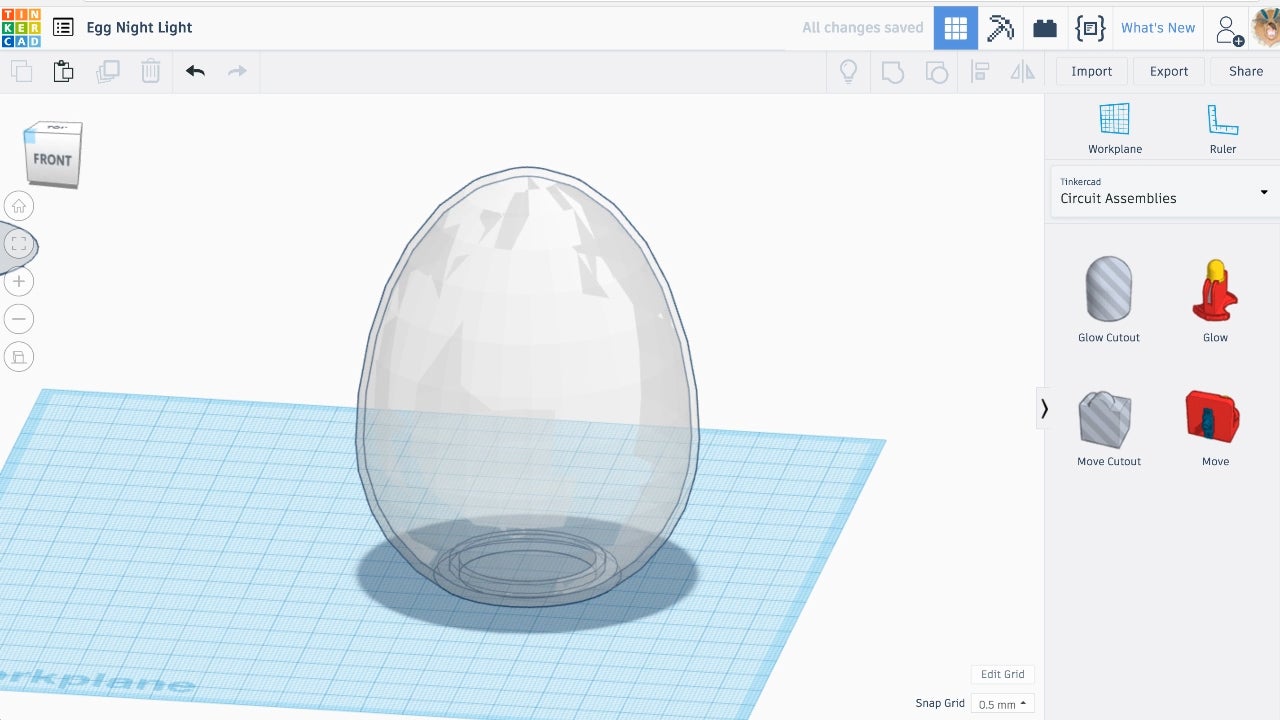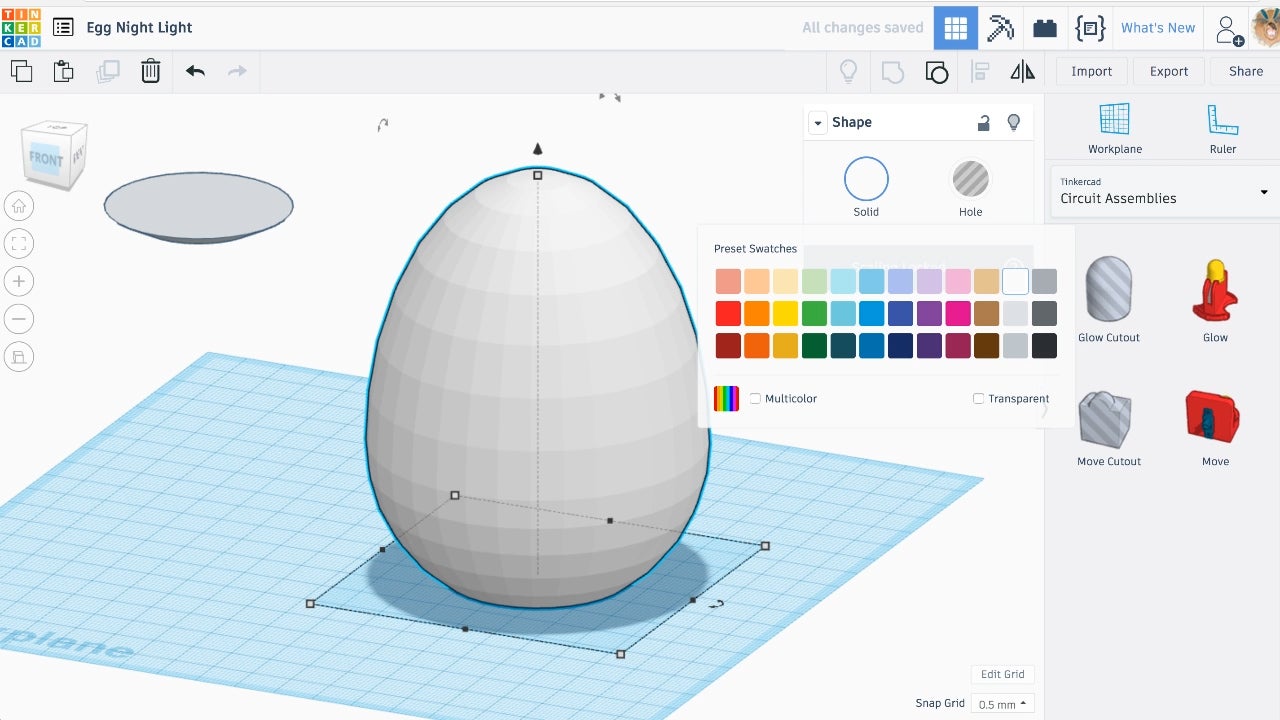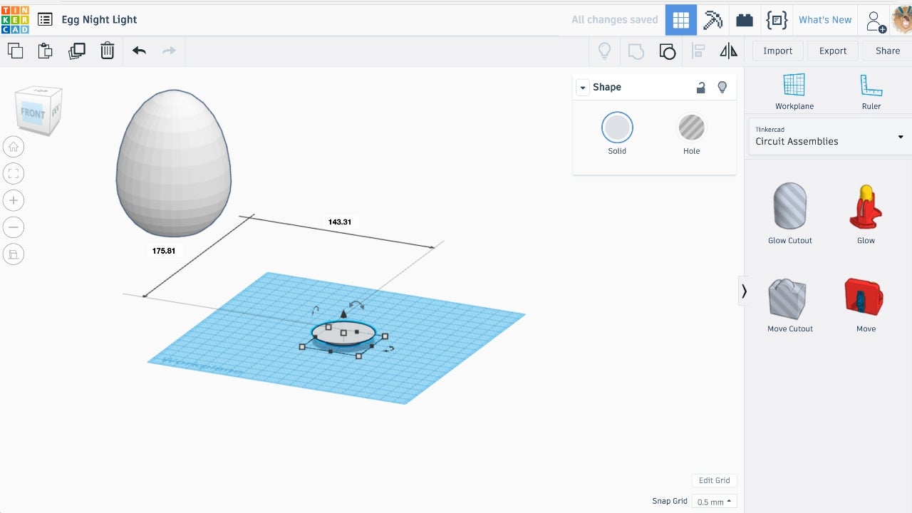 Tinkercad recently added two Circuit Assemblies to their shape menu offerings, one of which is the Glow Assembly, a plug-and-play LED circuit shape that I used to make my Egg shine bright.