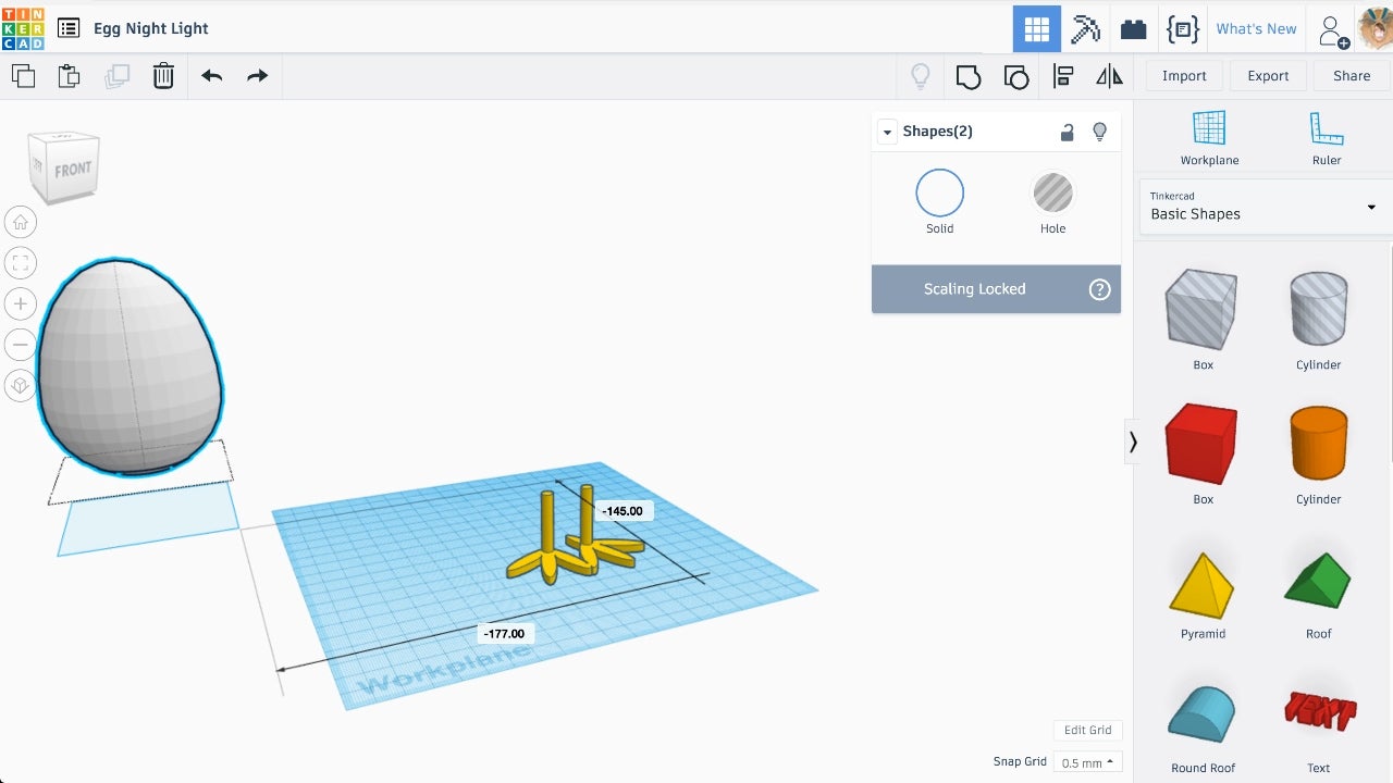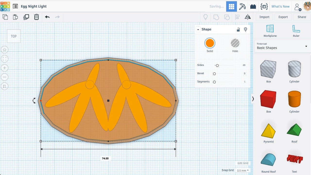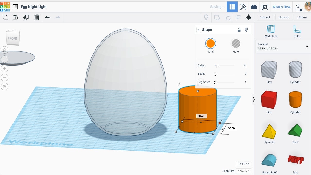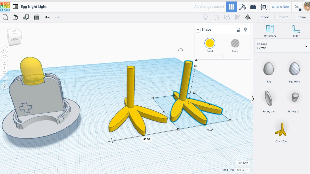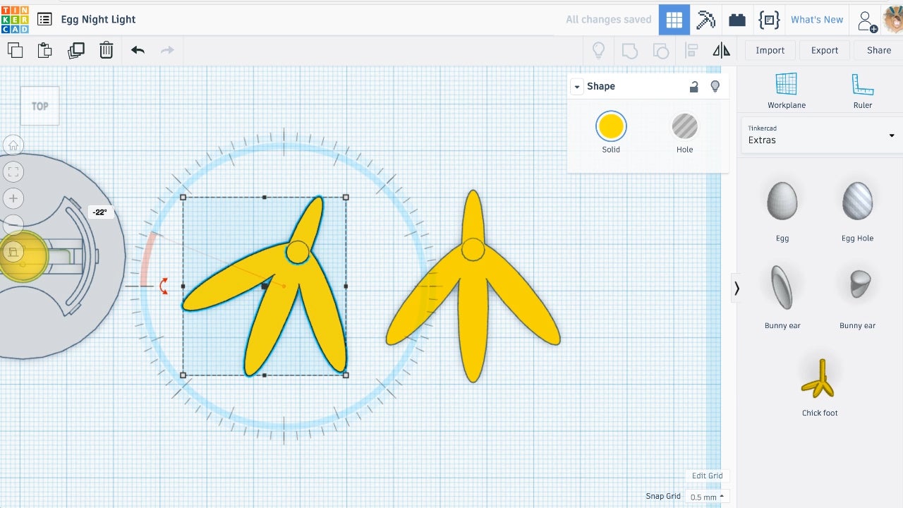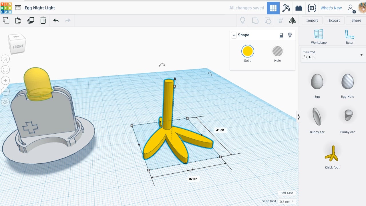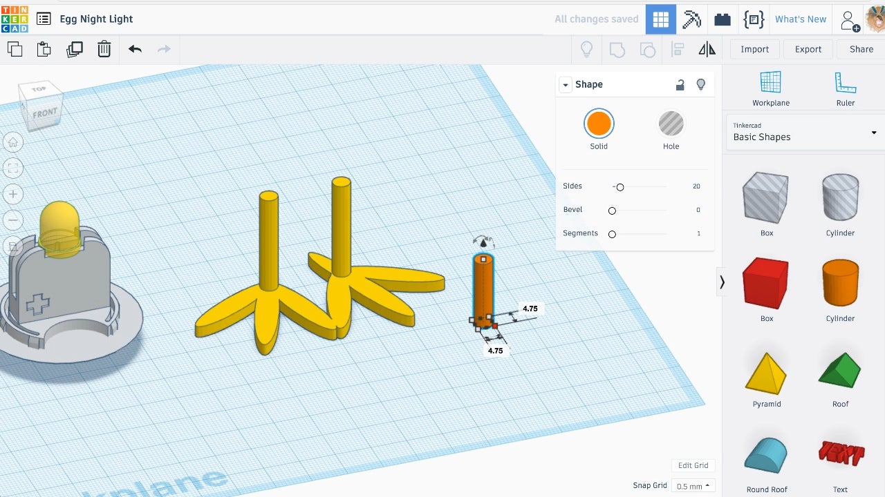 Tinkercad recently added two Circuit Assemblies to their shape menu offerings, one of which is the Glow Assembly, a plug-and-play LED circuit shape that I used to make my Egg shine bright.