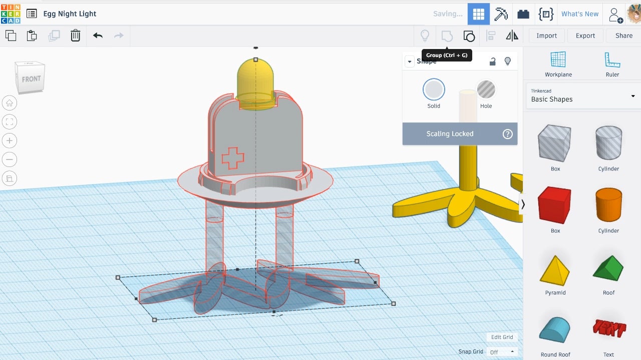 - Select both the legs HOLE and the egg bottom/holder and click on GROUP. This will create holes in the bottom of the 3D printed egg holder that the printed set of legs will fit into.