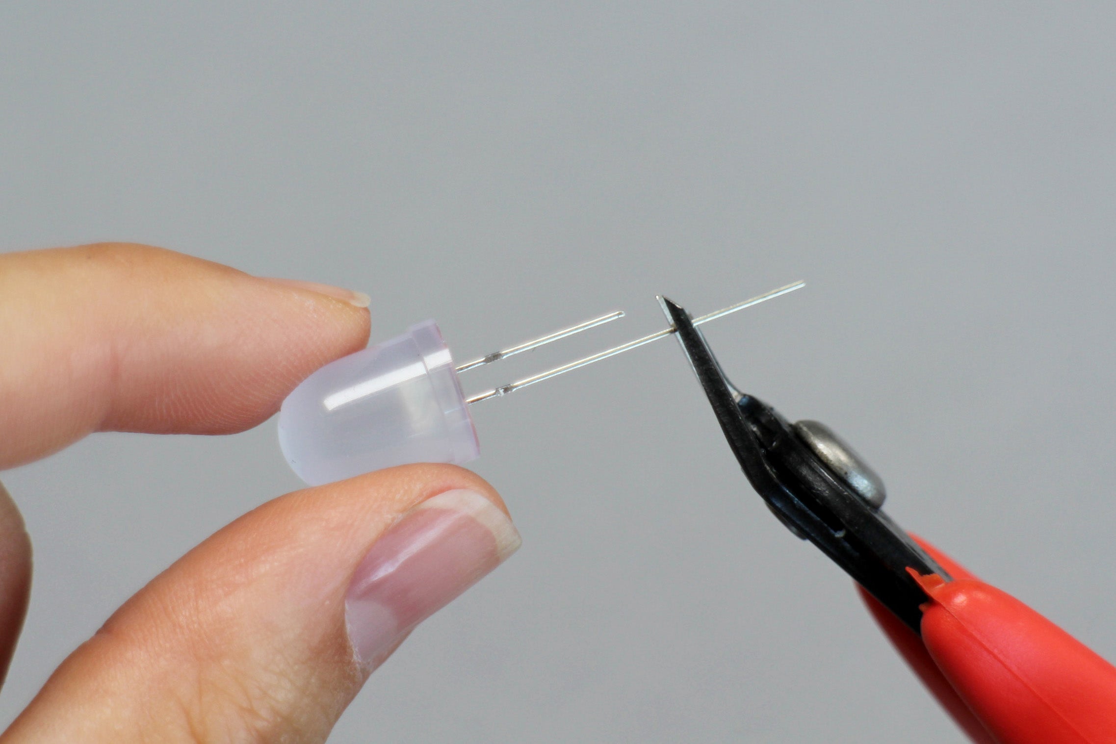- Use your wire cutters to trim about 1/2" off of each LED pin, making sure to keep the length differences.