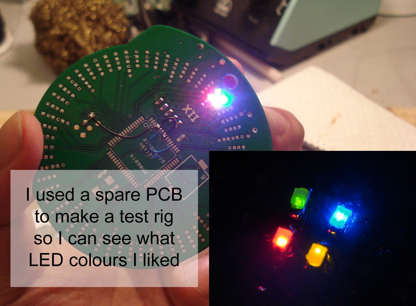Aside: since when you order PCBs from Seeed Studio, you get 10 copies, I wasted a board to test the LEDs, so I can decide on what colours I want. Here are a few pictures of the test rig and the LEDs: