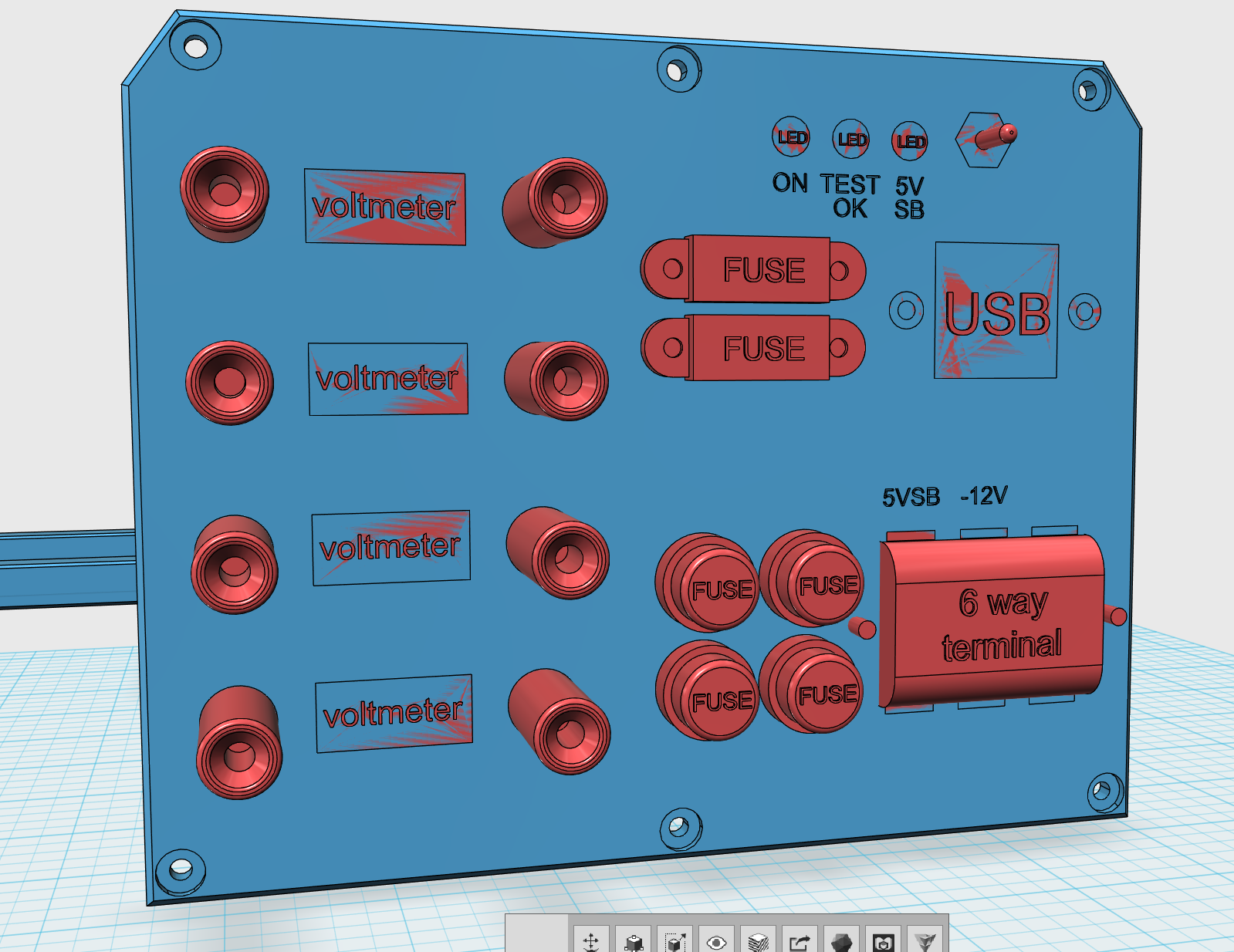 If you wish to make modifications, i have included a "clean slate" front plate, so you can place the components where you desire, or add and remove the components as you wish. I found that its a good idea to draw the components out, as they are completely, and not just the part where the hole needs to be. When done like that, you can lock the components in place on the front place, and assemble it with the rest of the case, to see if theres enough room for the components where you want them, before printing the front plate. I originally had a different layout on the front plate, but it turned out there wasnt enough room for the USB and fuses to fit inside the case.