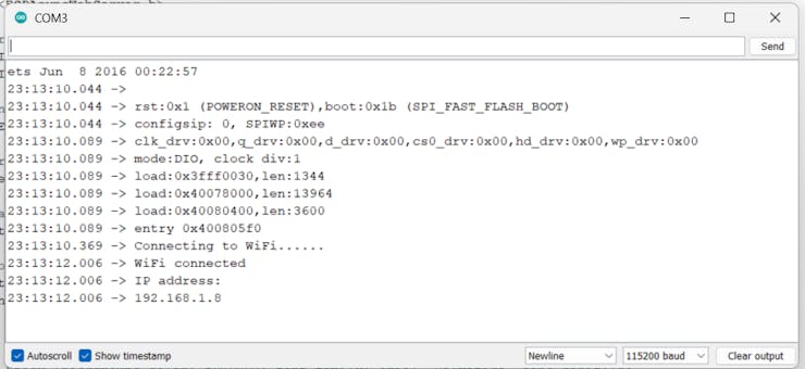 To test the web server, you need to upload the code to the ESP32 board and open the serial monitor. You should see the IP address of the ESP32, which is something like 192.168.1.8