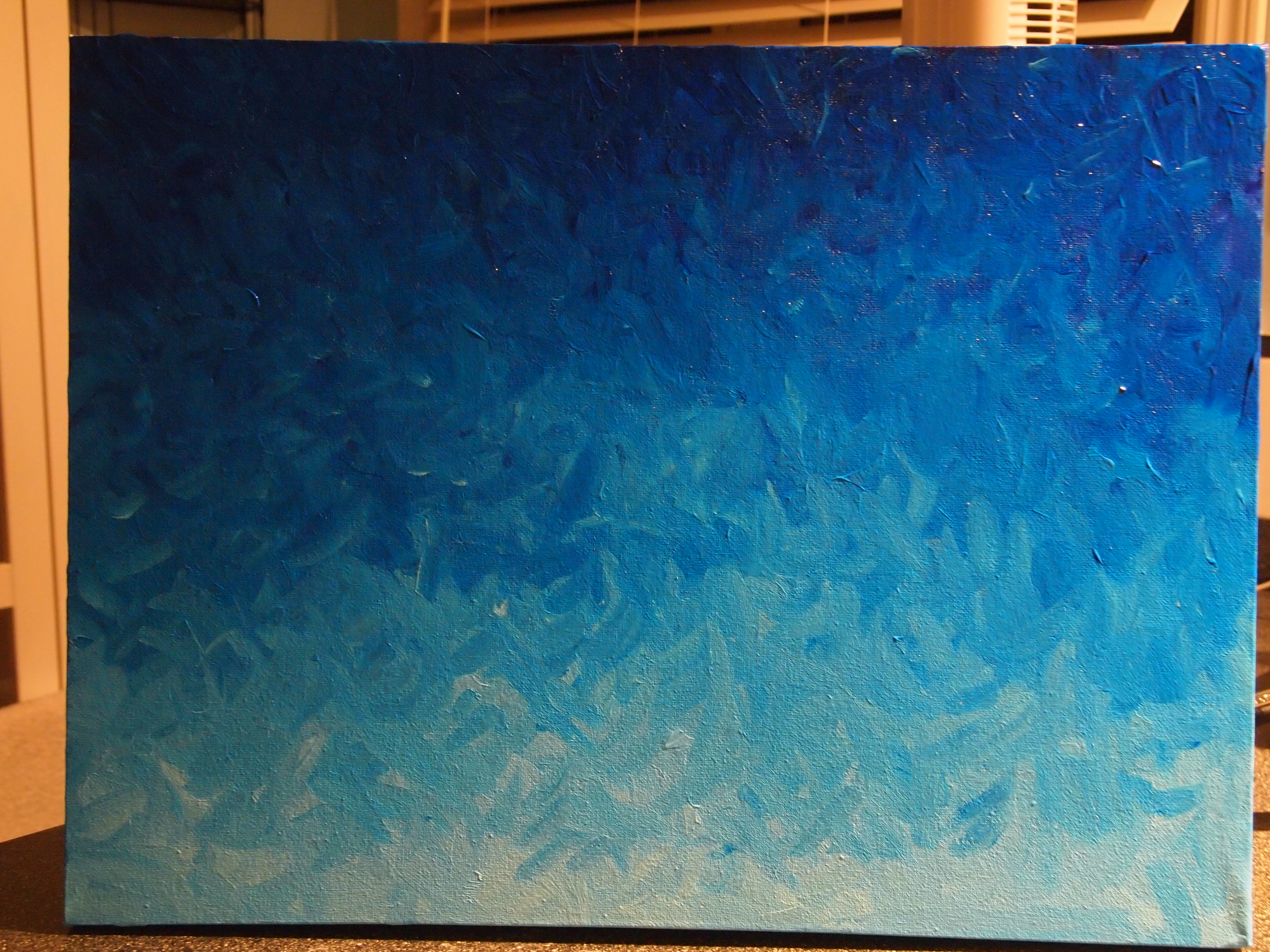 Get yourself a large medium canvas for the background, and paint with dark blues using large brush strokes starting from the top. Add little bits of white to your blue paint, getting lighter as you paint down to a lighter blue and until you have a gradient.