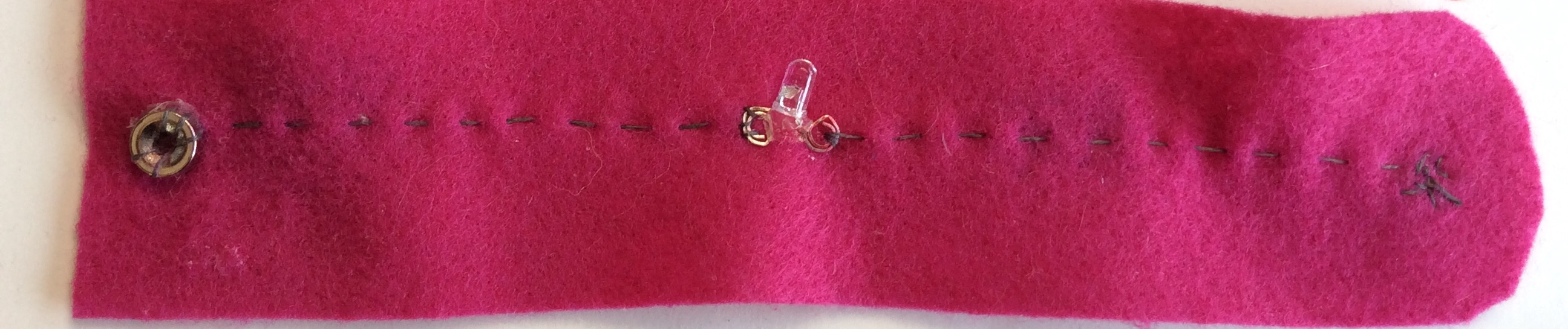 It's important that the thread from the negative leg does not touch the thread used to sew the positive leg, in order to prevent a short circuit.