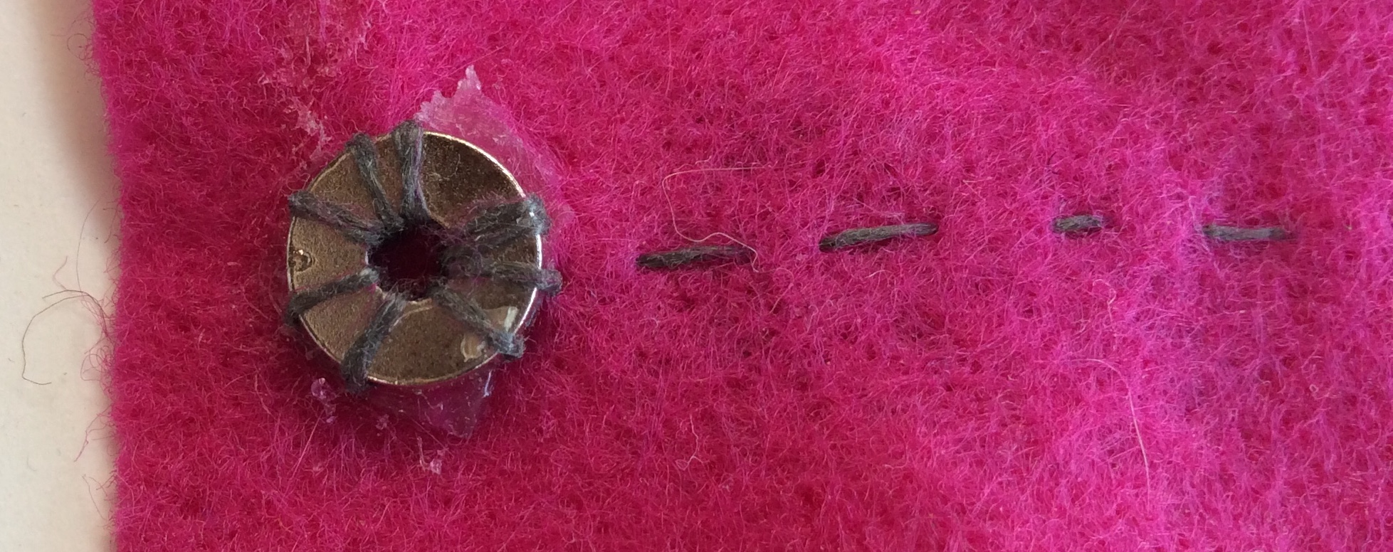 When sewing around the magnet, make the stitches resemble the spokes of a wheel. Make a knot on the fabric backing the magnet and tie a knot. Knots should be sealed with a dab of hot glue or some clear nail polish.