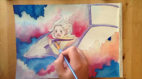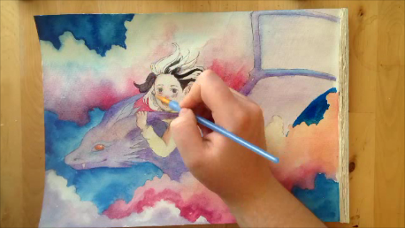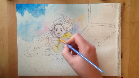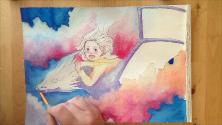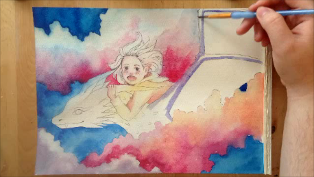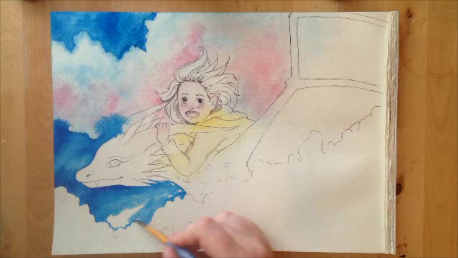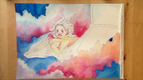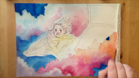 We are going to begin this painting off with the background and a light color base, using light blues then building up to a sky blue where the clouds aren't present with a flat brush. Then start adding little bits of pink and orange to create a dreamy sunset base with a round brush. Add late warm shades on the character very watered down as we'll build up in layers. At a light base like this its alright for colors to bleed into each other. Make sure to let everything mostly dry, before going forward with the next step.