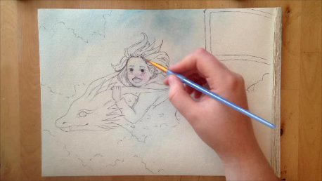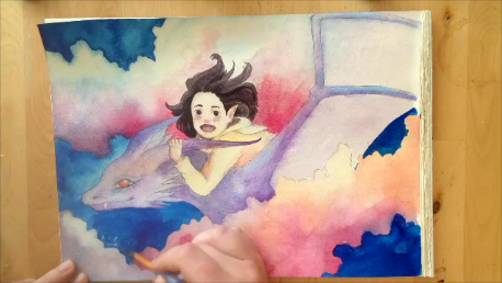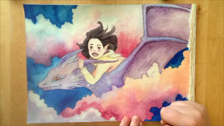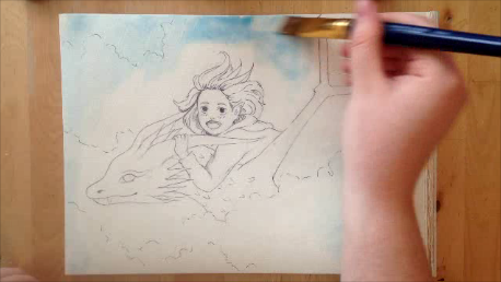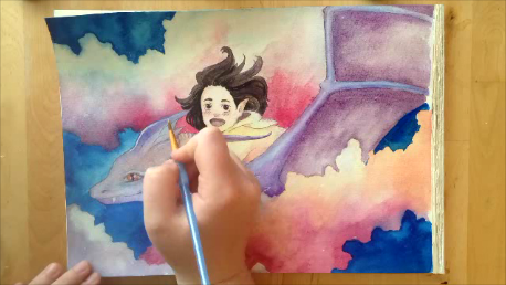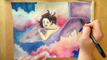 With a light opaque blue/white add highlights on spikes and clouds. Shade in the wings with a purple darker than the rest of the dragon. Outline the wings using some light stippling in the curves of the wings to shade. Outline the rest of the dragon and Lily and some areas to add slight definition.