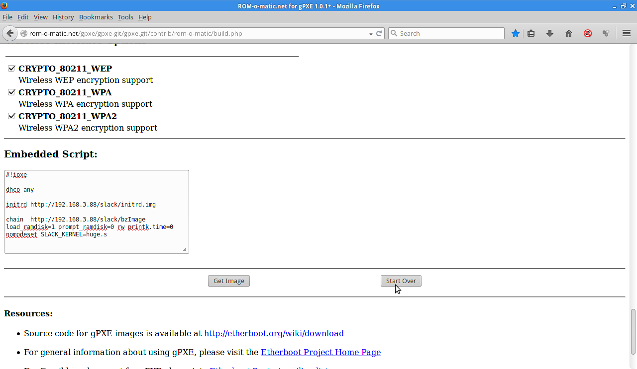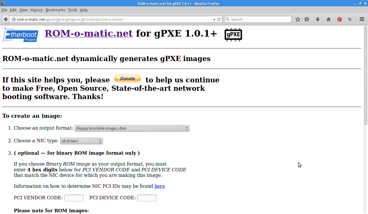 Etherboot led the way in this direction and had now graduated to Ipxe. (more information at www.etherboot.org). So we need to make a boot disk for the computer we want to install linux on. You have severaal choices. For our purposes a floppy will be used. You can also use a cd/dvd rom disk and or a very small usb stick. We need to go to www.romomatic.org to create the boot media for our system.