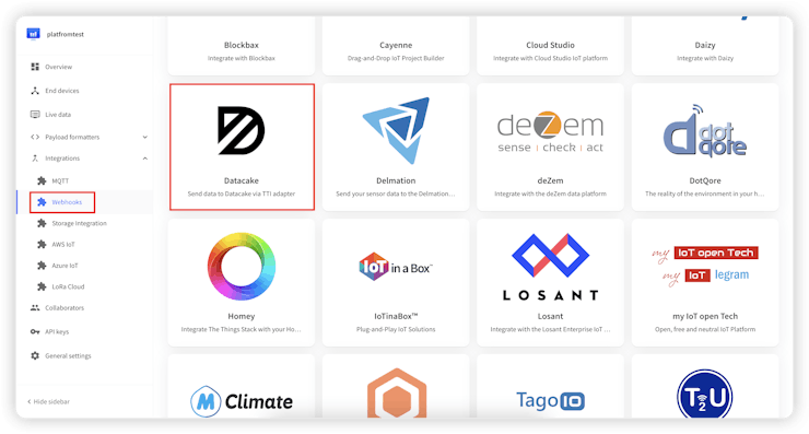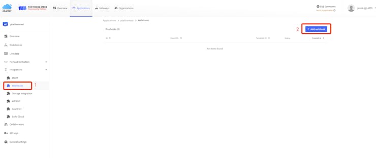 On The Things Stack, navigate to Integrations → Webhooks, and click Add Webhook.