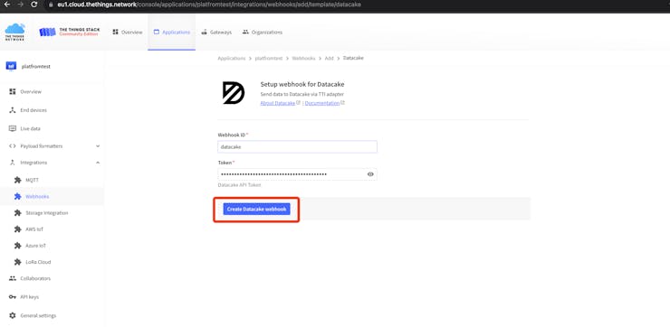 Name your integration by filling in the Webhook ID and paste the API token from Datacake for the authorization.