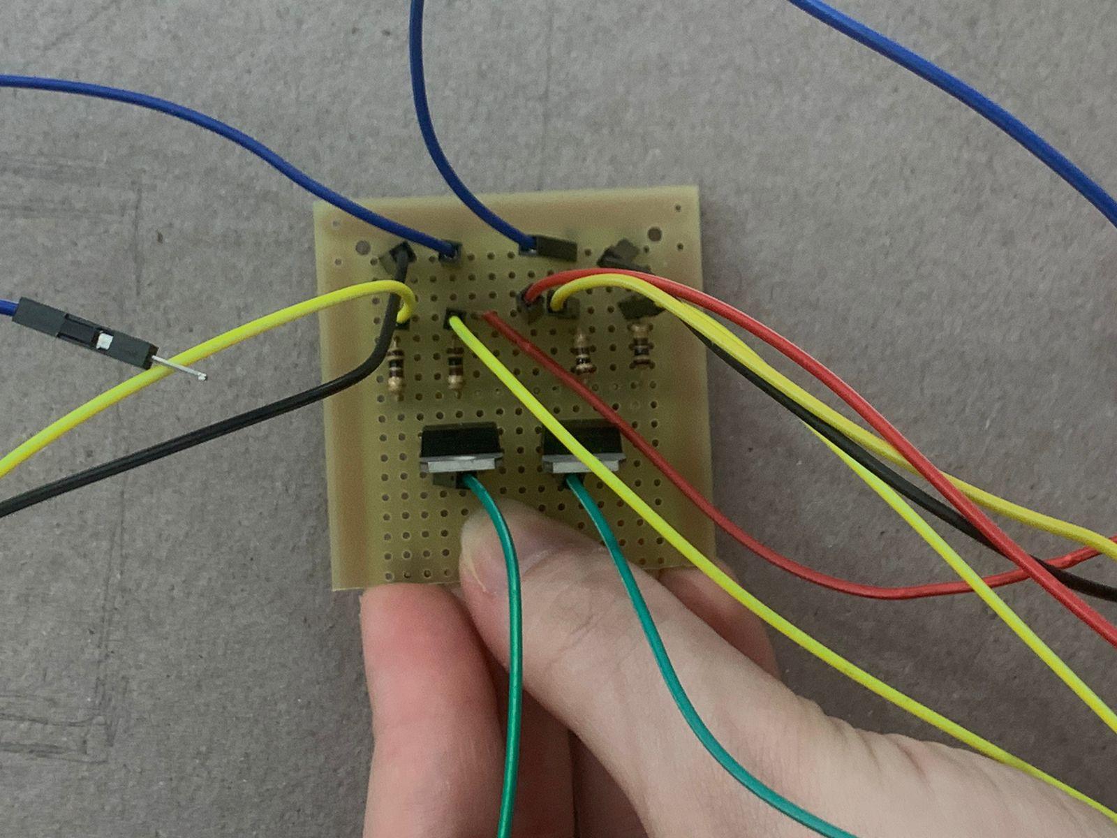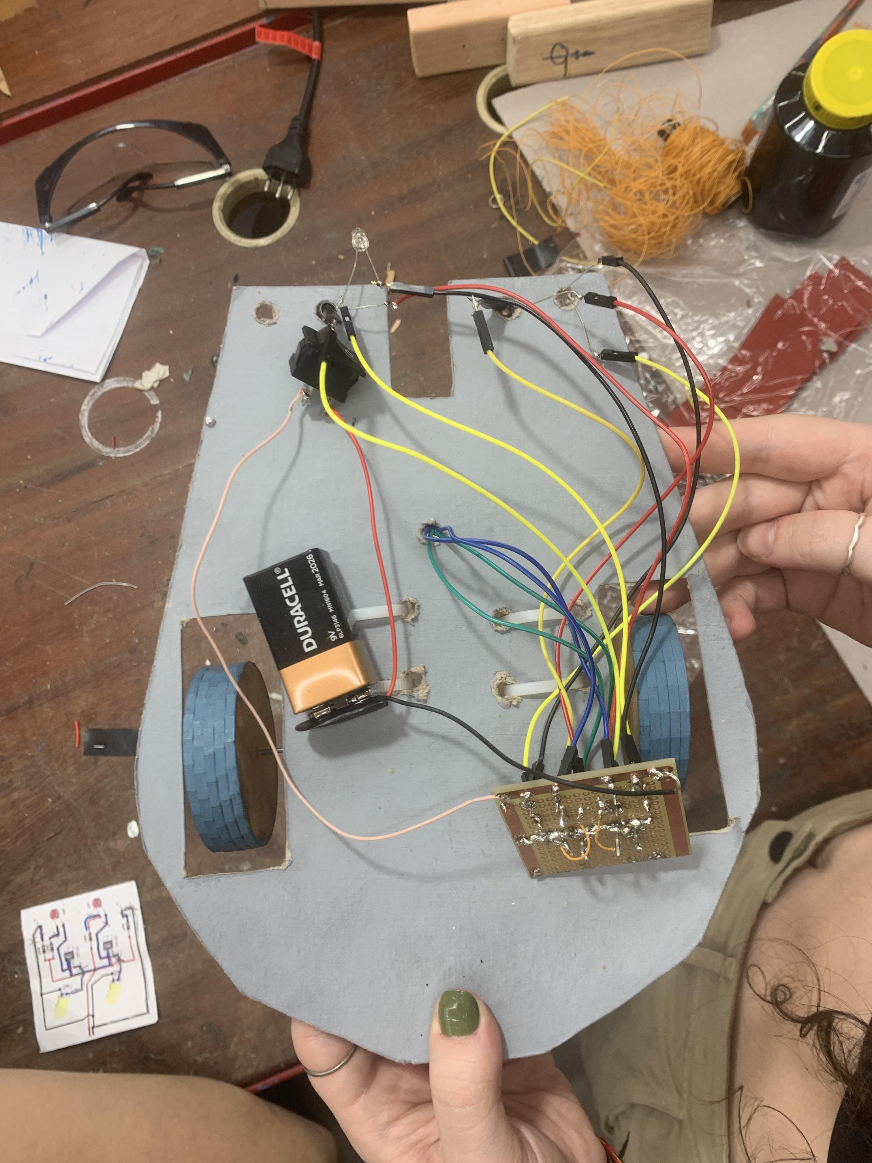 - Fazer um furo na parte central para passar os fios positivos e negativos dos motores presos na placa - utilizar o posicionamento dos próprios motores como parâmetro para o furo.