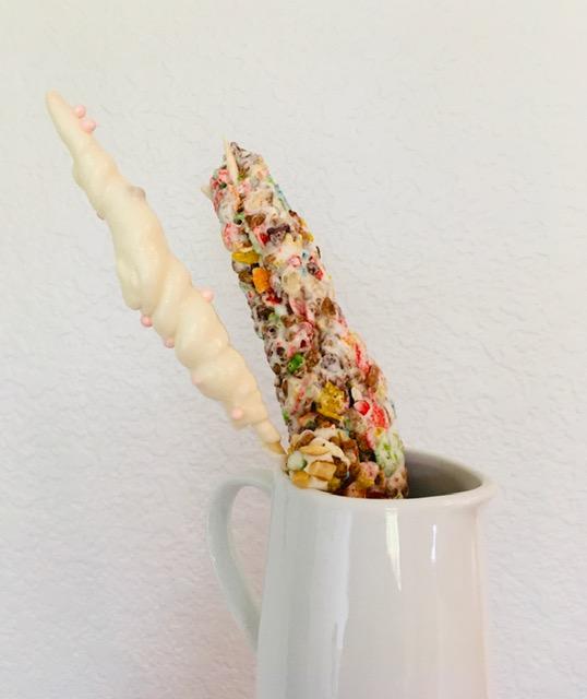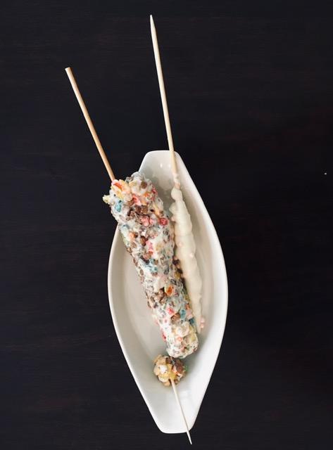 Before your marshmallow mixture cools off too much, put it on your stick using your fingers (it may be hot!) dipping, twirling, or your spatula. coating the bowl or marshmallow with butter helps to make this so much easier. Then, add your magical toppings! Note: if you want your creation to be like a Rice Krispy Treat, add Rice Krispies to the marshmallows before shaping it on the stick. You can also roll the marshmallow stick in your cereal or toppings. Add sprinkles, nuts, or other toppings if you like.