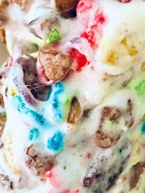 - Rice Krispies cereal (ny cereal will work as long as the pieces are small enough to stick to the marshmallow; I used a combination of chocolate Rice Krispies, vanilla Rice Krispies, and Fruity Pebbles)
