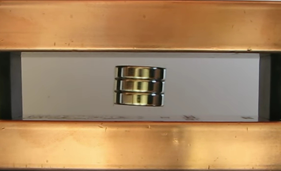 3. Finally something between the aluminum or copper block. By trail and error you can find the best distance between the blocks. With this size of magnets 25 mm seemed to be effective.